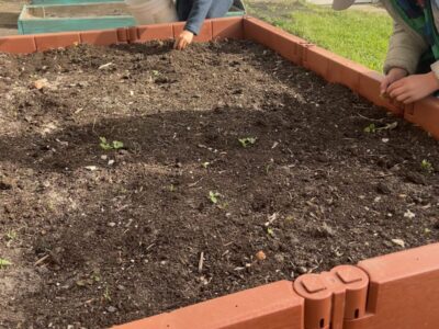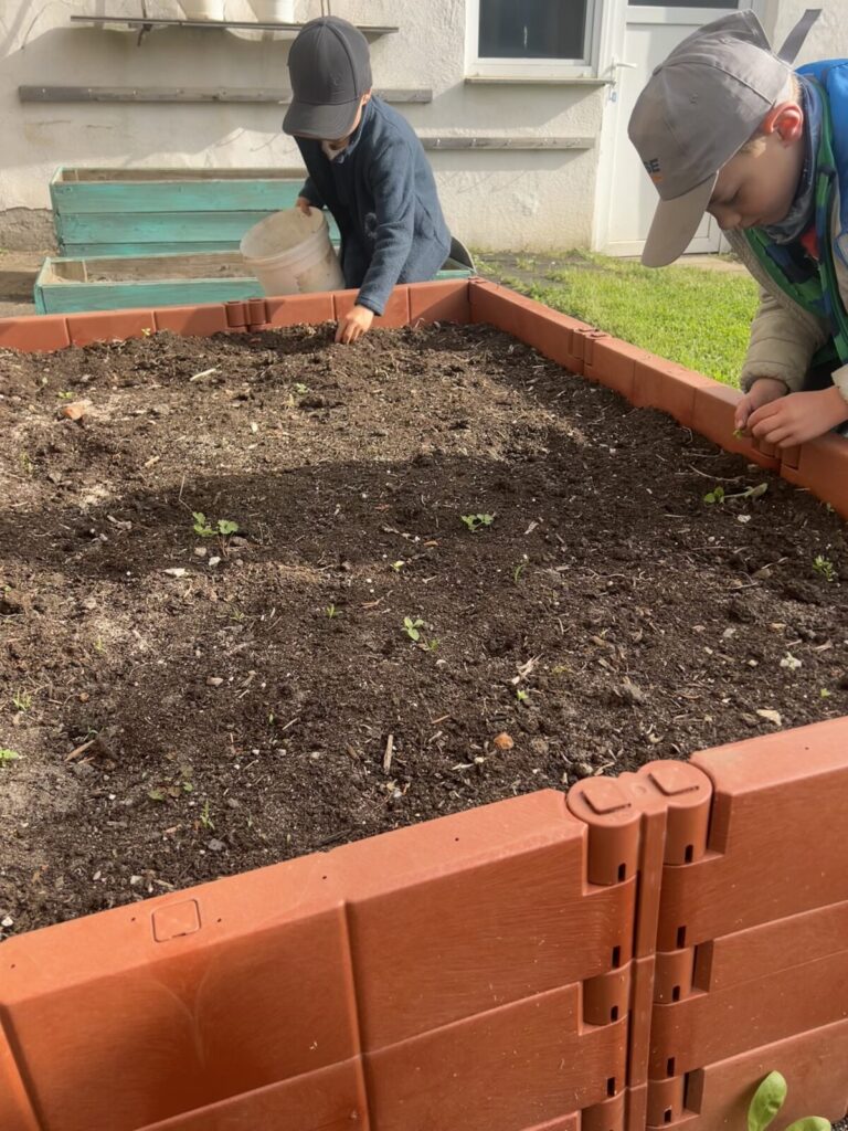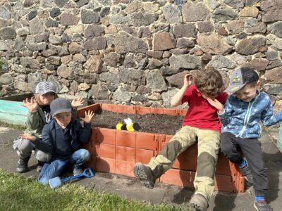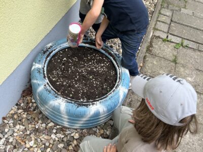 Nun schaut sich Biene Millie unser noch unbepflanztes Hochbeet an und wartet schon gespannt auf die ersten Knospen und Blüten. Unsere Schlaufuchs-Gruppe haben niedliche Bienen aus verschiedenen Alltagsmaterialien gebastelt, welche nun unser Hochbeet schmücken.