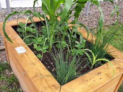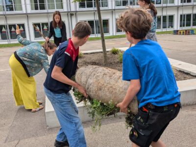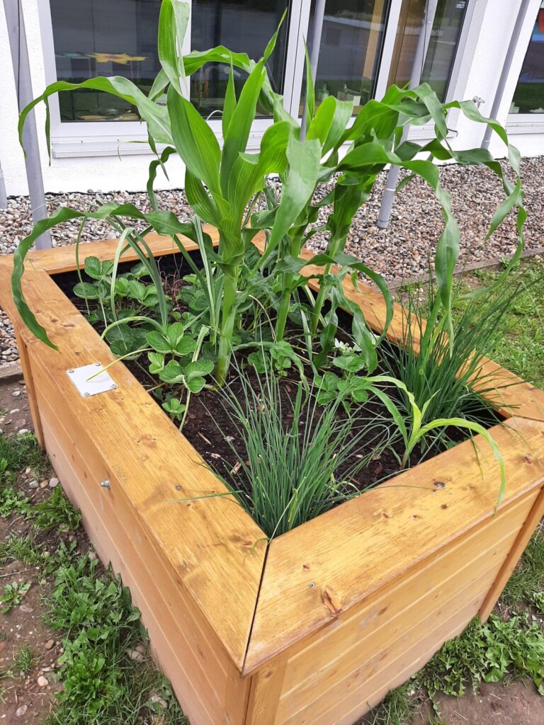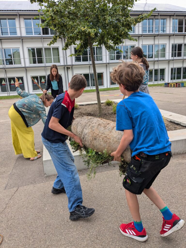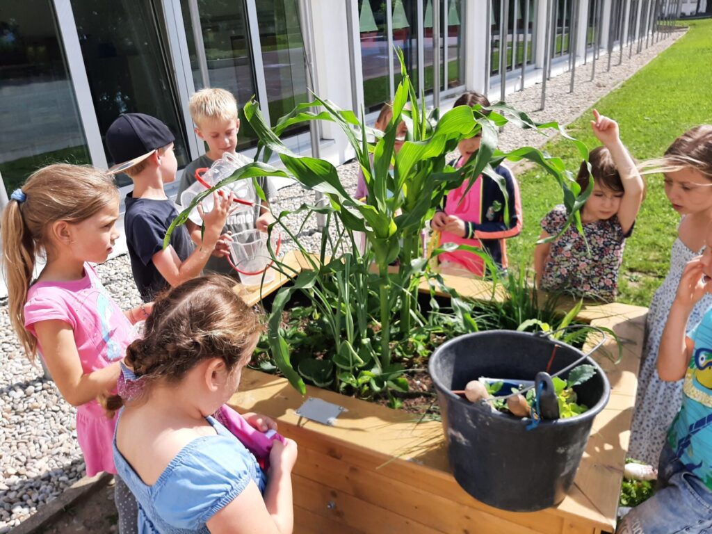 Einige Schülerinnen und Schüler der 1a haben Freude am Gärteln und helfen das Beet zum Blühen zu bringen.
