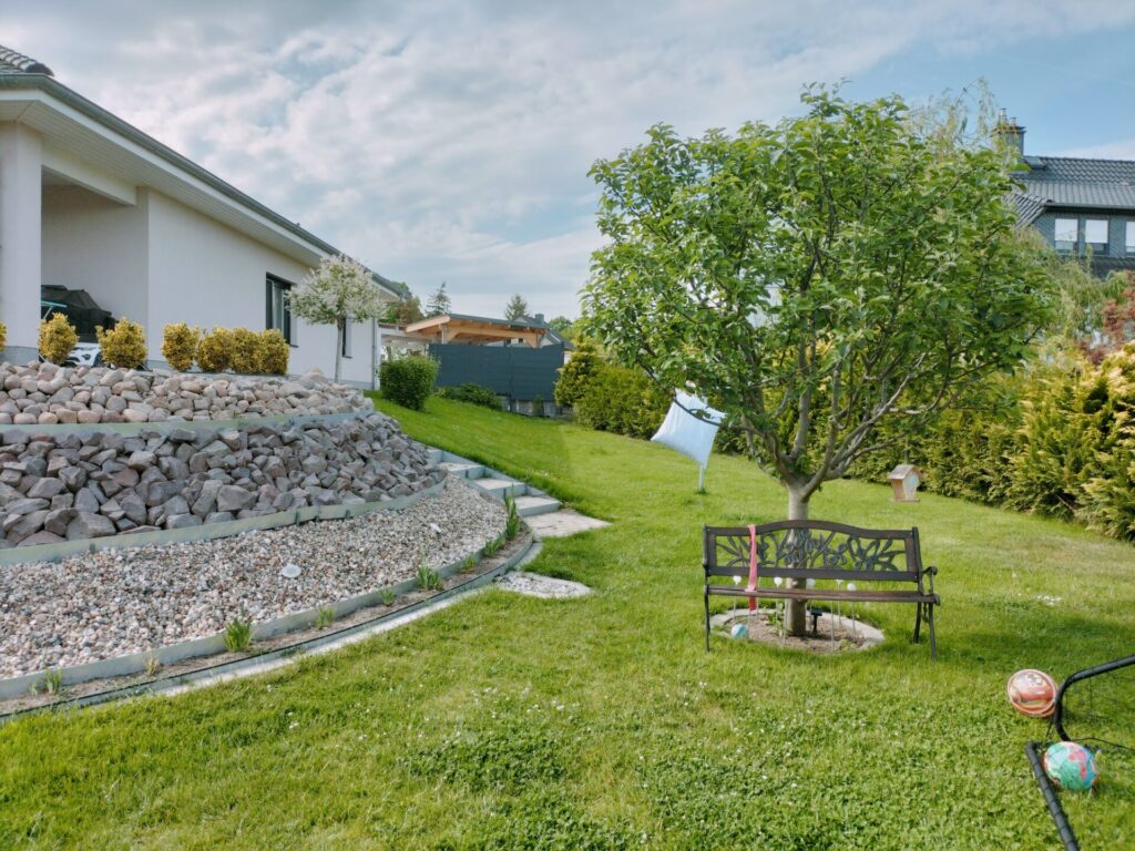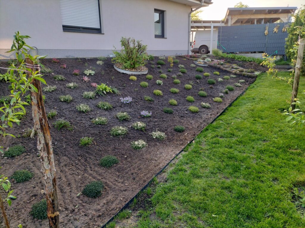 Auf unserem Grundstück haben wir zwei Hänge. Auf diesen Hängen hatten wir Rasen angelegt, jedoch wurden diese Flächen nicht wirklich von uns genutzt und das Mähen auf den Hängen war anstrengend. Daher haben wir uns entschieden, die Grasnarbe abzutragen und einen blühenden Teppich anzulegen. Nach Recherchen im Internet und Beratung in einer Gärtnerei haben wir uns dazu entschieden, den Hang mit verschiedenen Thymian-Arten zu bepflanzen. Zusätzlich haben wir eine naturnahe Treppe aus Eichenstämmen angelegt und diese ebenfalls mit diversen Bodendeckern bepflanzt. Um kleine Akzente zu setzen und die Treppe nutzen zu können, haben einfach Steinplatten mit reingelegt. Unser Projekt haben wir im März 2024 begonnen. Mittlerweile blüht es schon herrlich. Der Duft des Thymians wird bei jedem Vorbeigehen verströmt und die Bienen, Schmetterlinge und viele weitere Inseken besuchen unser Beet täglich.