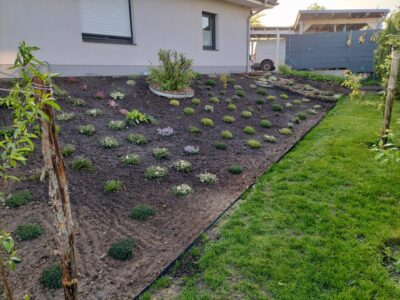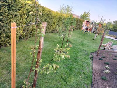 Des Weiteren haben wir die noch vorhandene angrenzende Rasenfläche mit diversen Obstbäumen bepflanzt (Mirabelle, Aprikose, Pfirsich und Birne). Zukünftig soll diese Fläche als Streuobstwiese dienen und für uns natürlich als Obstquelle aus dem eigenen Garten.