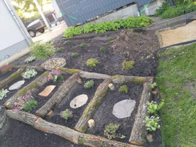 Des Weiteren haben wir eine Ecke mit Sand und einer trocknen Bauwurzel angelegt, um auch hier Bienen und anderen Insekten einen Unterschlupf zu gewähren. Geschmückt mit Resten von den übrig gebliebenen Abschnitten der Eichenstämme und alten Wagenrädern, setzt diese Ecke einen zusätzlichen Akzent. Angrenzend von diesem Sandbeet haben wir Zitronenmelisse gepflanzt und unsere Pfefferminze Platz gegeben. Somit ist das Sandarium umgeben von Zitronenmelisse und Pfefferminze und bietet genug Nahrungsquellen.
