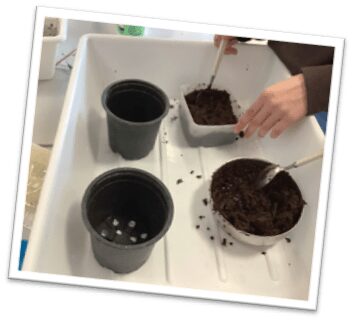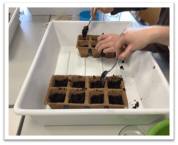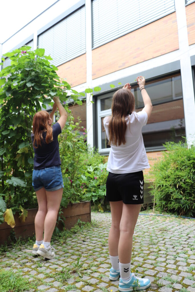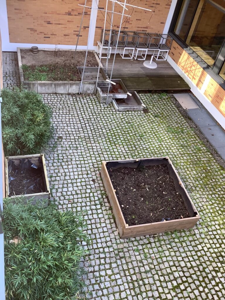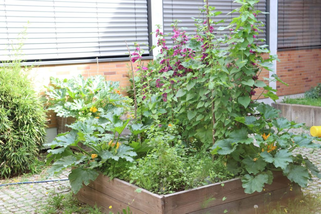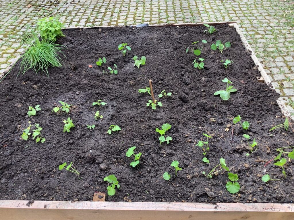 Der Wunsch, unser gepflastertes Schul- Atrium erblühen zu lassen, war schon lange da. An einem Nachhaltigkeitstag wurden 2019 von einer motivierten Projektgruppe 3 Hochbeete angefertigt. Die Beete waren bereit, blieben aber mehrere Jahre leer. Im März diesen Jahres beschloss unsere "Oken-Umwelt- AG" (derzeit 10 Schülerinnen und Schüler der Klassen 6-8), das Atrium endlich aus seinem "Dornröschenschlaf" zu erwecken. Die Beete wurden mit Erde aufgefüllt und startklar gemacht. Eine Pflanzenvielfalt von B-Z wurde von uns noch im März selbst vorgezogen, ausgesät oder per Wurzelteilung in den Innenhof geholt: (Gewöhnlicher) Beifuß, Duftende Platterbse, Kapuzinerkresse, Pfefferminze, Ringelblume, Schafgarbe, Echte Zaunwinde, Himmelblaue Prunkwinde, Prachtwinde, Sonnenblume, Wilde Malve, Zitronenmelisse und Zucchini. Schnittlauch und Zitronenthymian wurden uns zusätzlich gespendet.