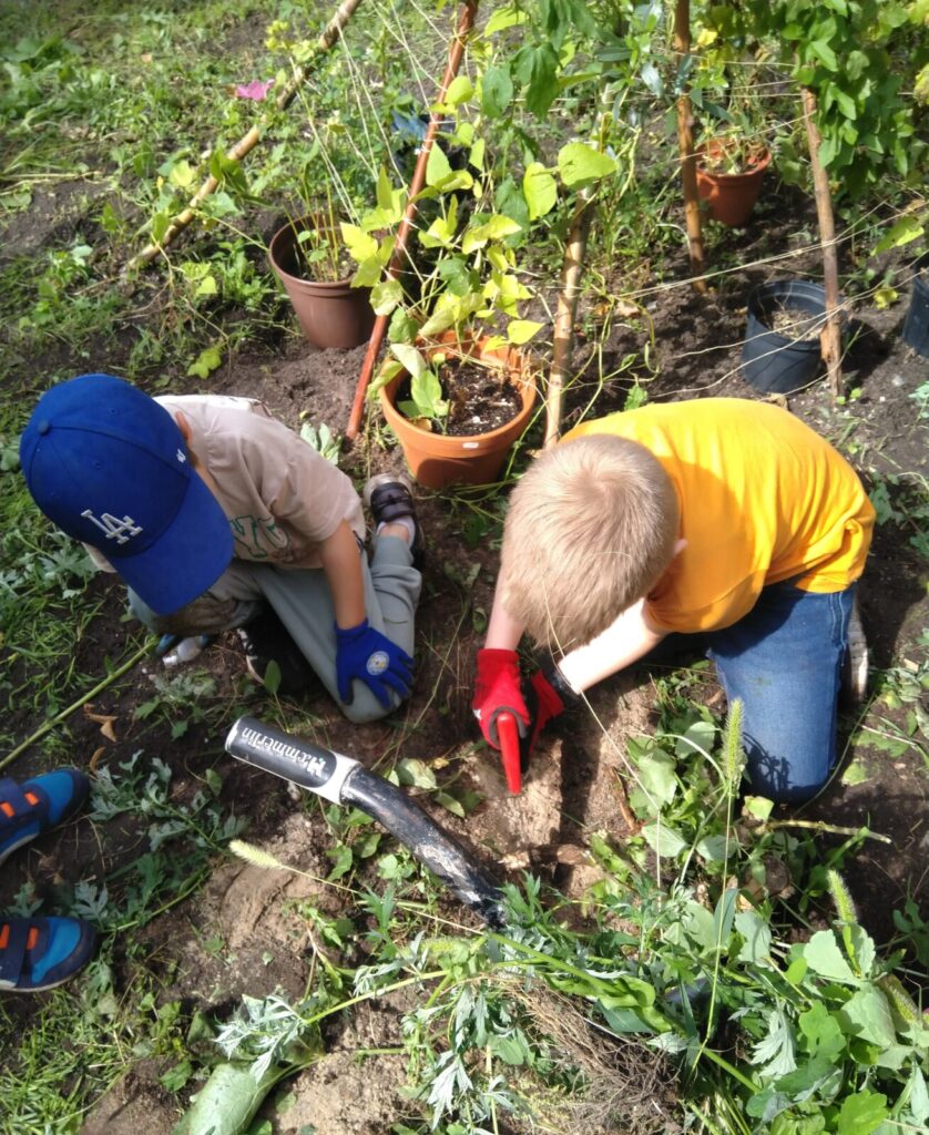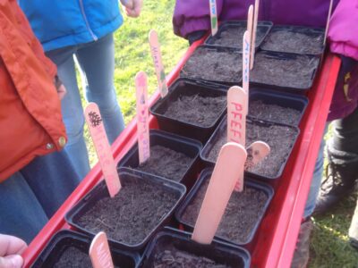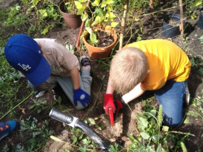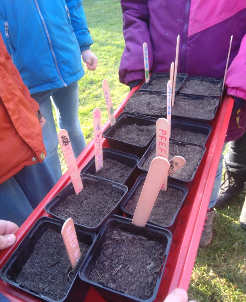 Grundschüler in der Gartenstunde, Schwerpunkt Unterricht, die Gänseblümchen AG und viele fleißige Eltern. Vernetzt und koordiniert von einer Erzieherin und unserer Garten AG, bestehend aus der Schulleitung + drei Lehrer* Innen.