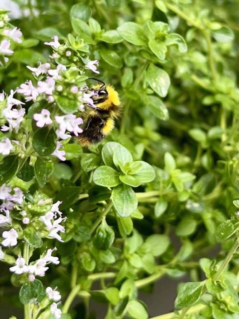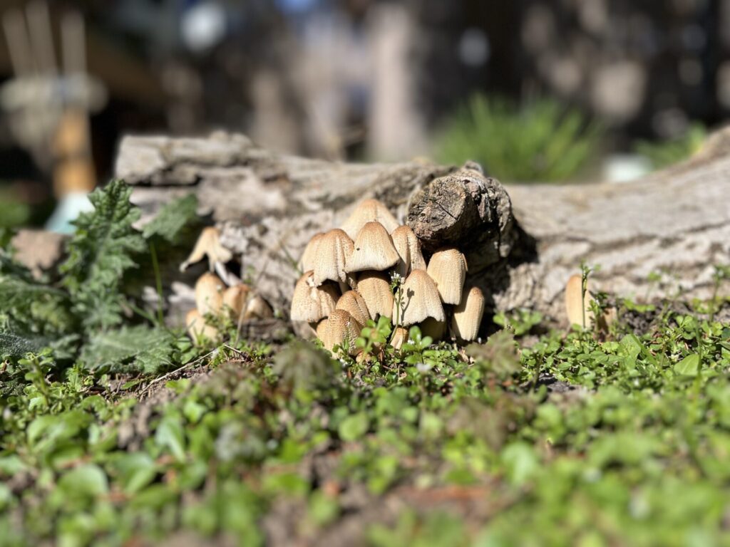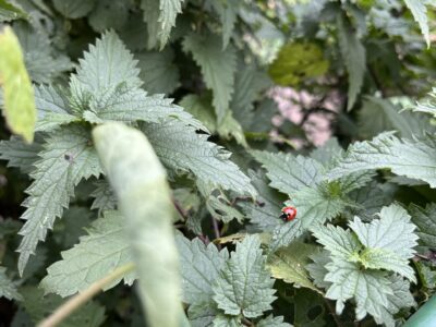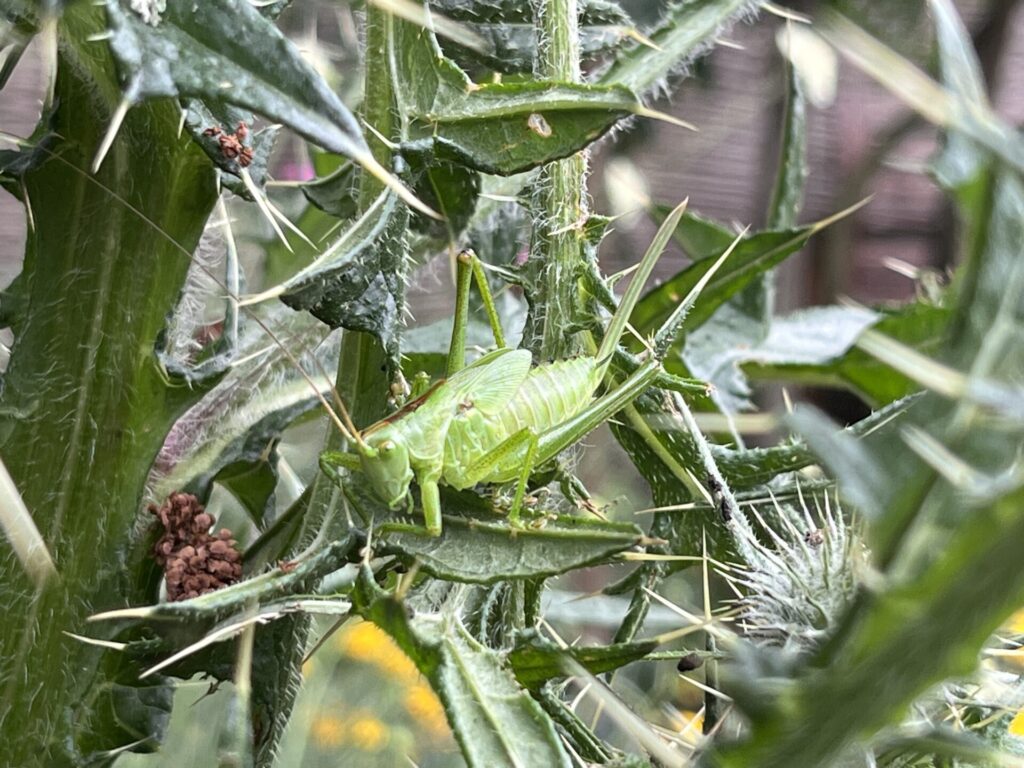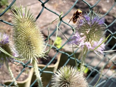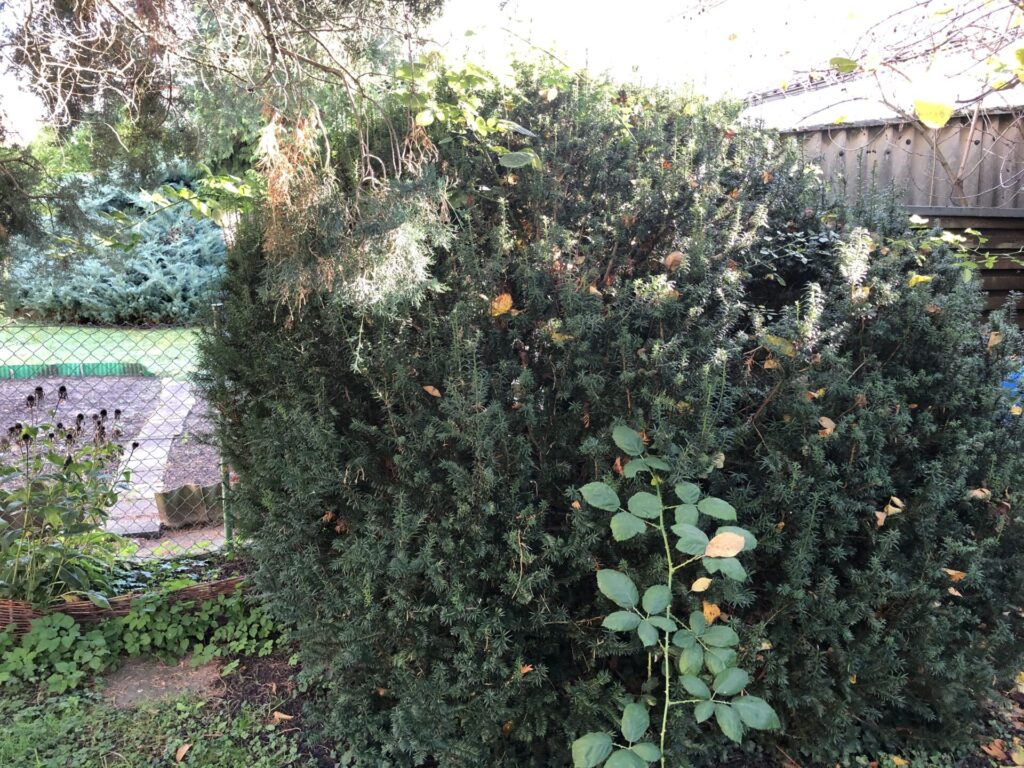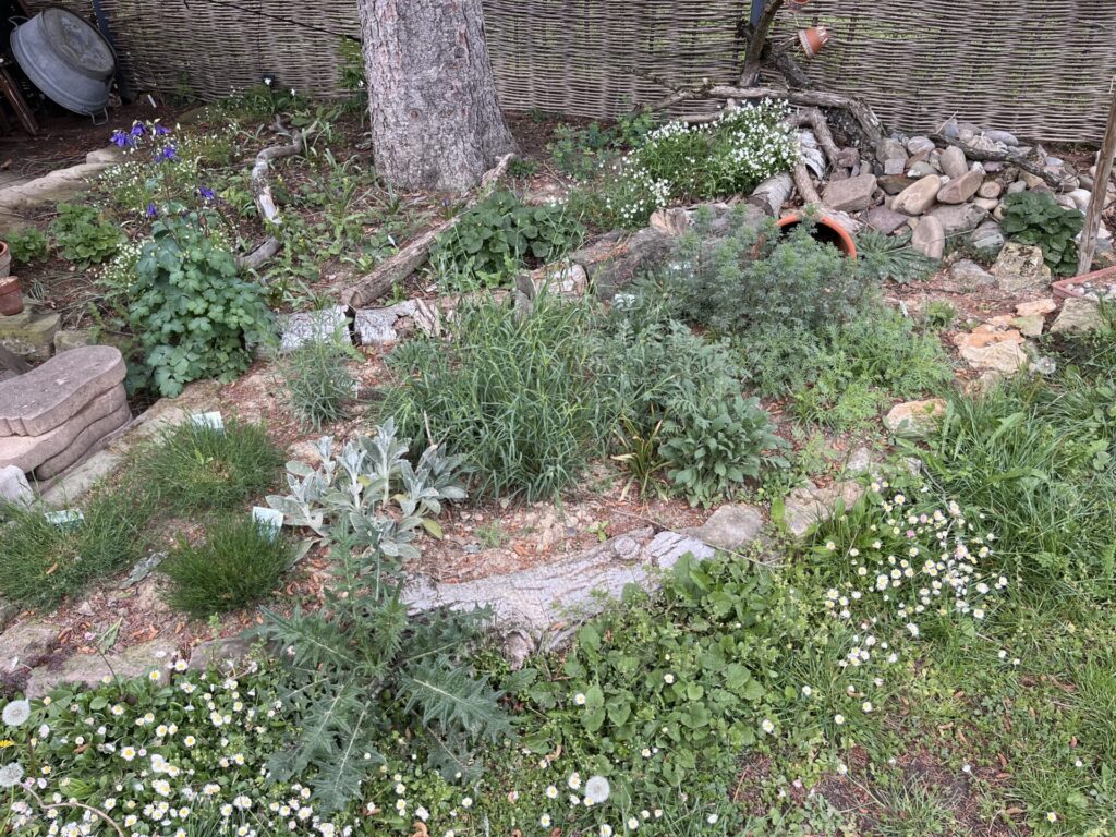 Unter einer riesigen Fichte, ist über Jahre fleißig Efeu und Immergrün gewachsen. Dort Blüht heute das Duftveilchen, die große Sternmiere mit der Goldnessel und dem Waldlaabkraut um die Wette. Damit im zeitigen Frühjahr schon etwas blüht, sind hier auch viele Frühjahrsblüherzwiebeln, wie Krokus, Winterling und Hasenglöckchen gesteckt. Im äußeren Traufbereich ist ein Insektenbeet angelegt. Es ist ein sehr sonniger und trockener Standort. Bisher haben sich u. a. Karthäusernelke, Felsennelke, Goldaaraster, Färberkamille und Natterkopf wunderbar entwickelt. Im Übergang ein Steinhaufen mit Totholz und Ohrenzwickerhotel. Dahinter wächst eine Berberitze, die hoffentlich in ein paar Jahren groß genug ist, um den Vögeln als Nistplatz zu dienen.