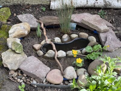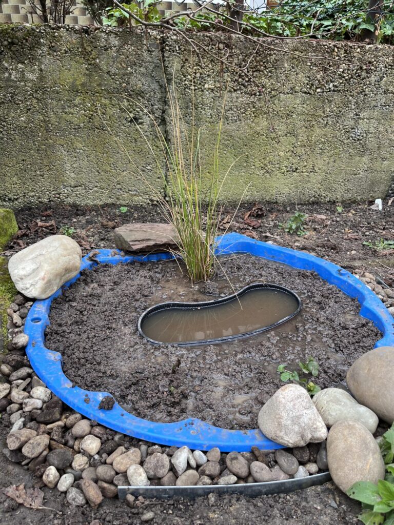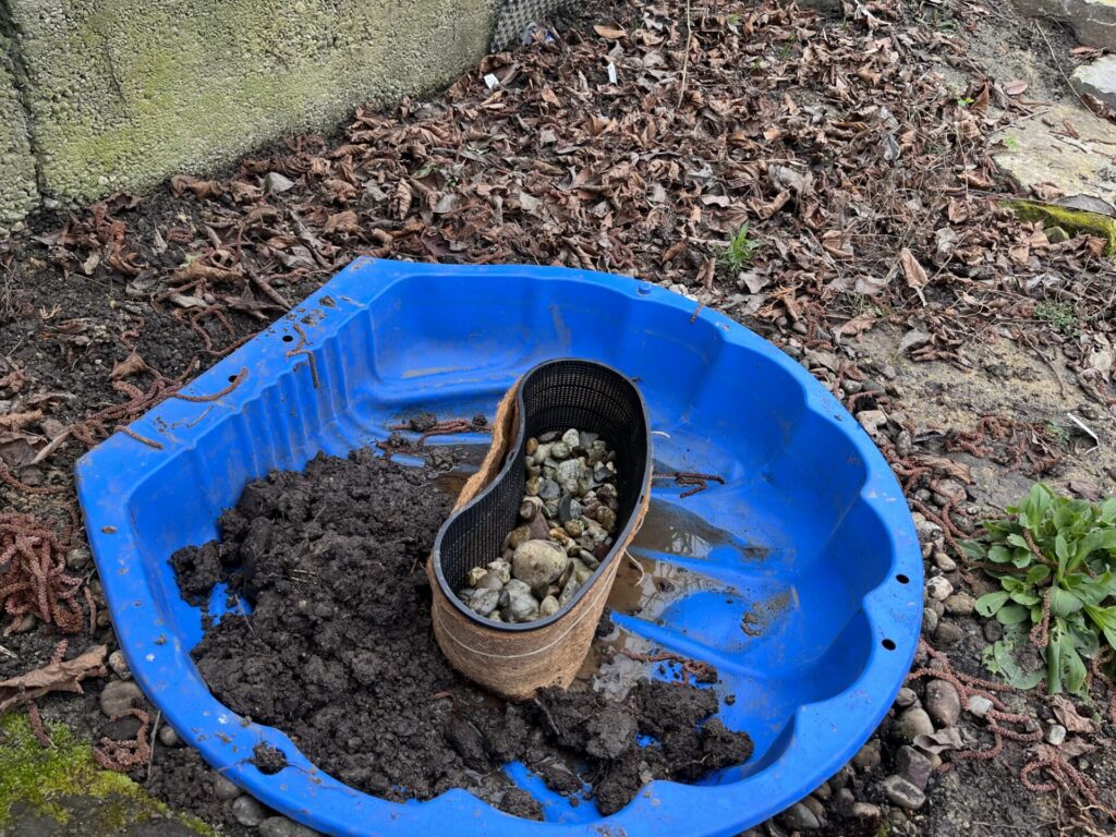 Ein Käferkeller, Sandbeet für Wildbienen, sowie ein Sumpfbeet fehlte jedoch noch. Ziel war, ebenfalls wieder mit möglichst viel vorhandenen Materialien zu Arbeiten. Da die Fläche in Summe nicht allzu groß und für eine angemessene Sandlinse kein Platz vorhanden ist, habe ich mich für eine sonnige Fläche an der Grundstücksgrenze, neben der Benjeshecke entschieden. Das Sandbeet ist auf einer Größe von ca. 75 cm x 50 cm und 50 cm tiefe, durch Aufhügelung entstanden. Den ungewaschenen Sand habe ich über einen Baustoffhändler bezogen, der diesen aus einem nahegelegenen Steinbruch hatte. Angrenzend ist flach abfallend ebenfalls ein tiefes Loch gegraben worden, mit etwas groben Kies und dann mit Laub, Reisig, größeren Holzstücken und Ästen gefüllt. Ausserdem hatte ich noch sehr viele alte Gartenplatten aus Beton. Diese wurden zerschlagen und dann als Steinturm auf den Käferkeller gesetzt. Für das Sumpfbeet wurde eine alte Sandmuschel genutzt. Der Erdaushub, vom Löcher graben wurde zum Teil wieder in die Sandmuschel gefüllt, der Rest für einen Kartoffelturm verwendet. In der Mitte ist ein Teichpflanzen Einsatz mit Kies gesetzt, um doch noch einen kleinen Wasserbereich, ohne Erde für die Vögel zu haben.