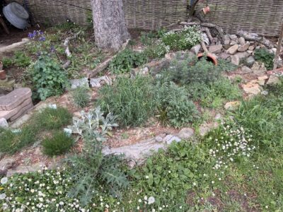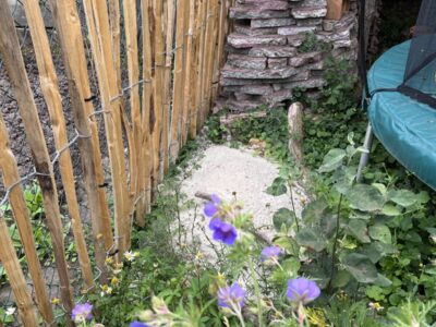 Im Frühjahr 2023 wurde in einer schattigen, von Brombeeren überwucherten Ecke eine niedrige, halbrunde Trockenmauer aus Muschelkalk als neue Beetabrenzung gesetzt. Die alte Einfassung fand im Steinturm wieder Verwendung. Dort befindet sich nun ein schattiges Naschbeet aus heimischen Wildstauden, Maibeere und Himbeeren. Angrenzend ein Wiesenblumenbeet u.a. mit Wiesenmargeritte, Wiesenstorchschnabel, Wiesenflockenblume, Teufelsabiss und Duftskabiose.