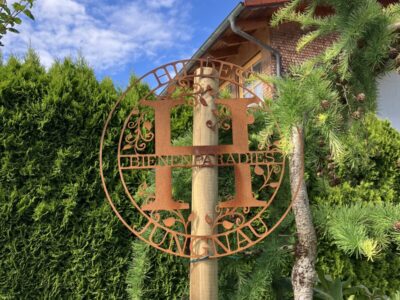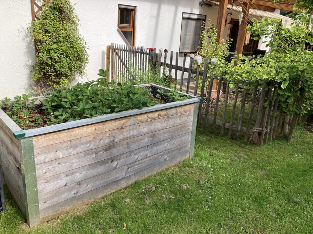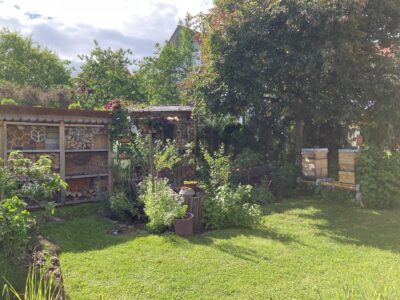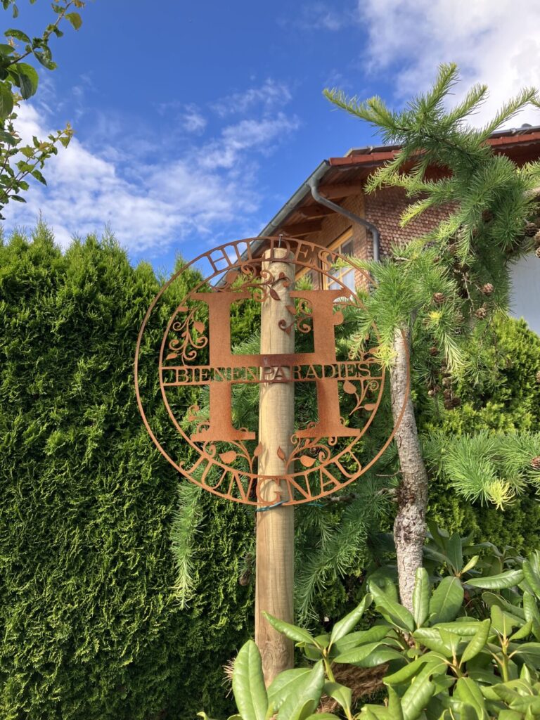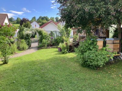 Außerdem besiedeln seit 3 Jahren auch eigene Honigbienen den Garten, die uns unser morgendliches Frühstücksbrot quasi direkt aus dem Garten belegen.