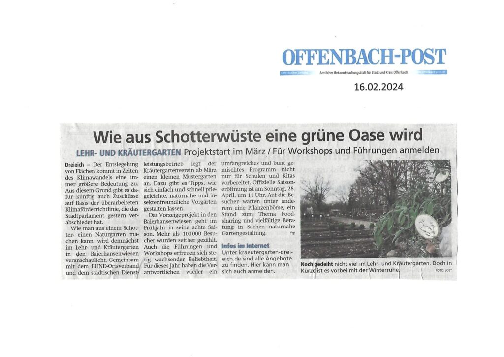 Seit der Eröffnung im Jahr 2016 erfreut sich der Lehr- und Kräutergarten der angrenzende Naturlehrpfad, Bienenlehrpfad und Streuobstwiese immer größerer Beliebtheit. Mittlerweile ist er weit über die Grenzen von Dreieich hinaus bekannt und hat sich als ein Vorzeigeprojekt für die Stadt entwickelt. Dafür sprechen die weiter ansteigenden Besucherzahlen (12.000 p.J.) und die Beliebtheit der angebotenen Workshops.