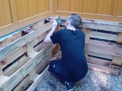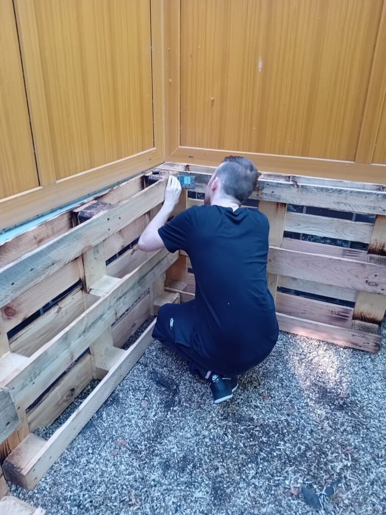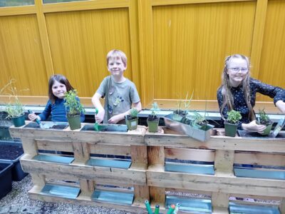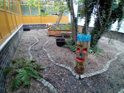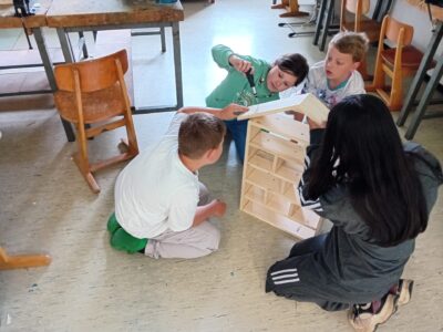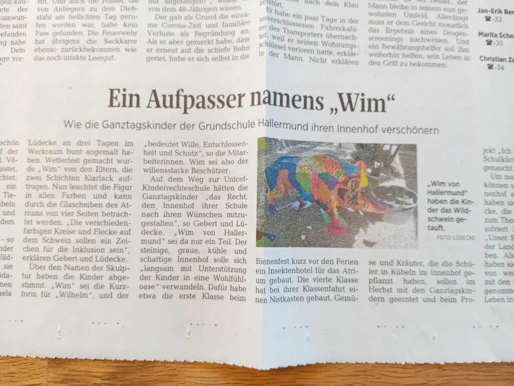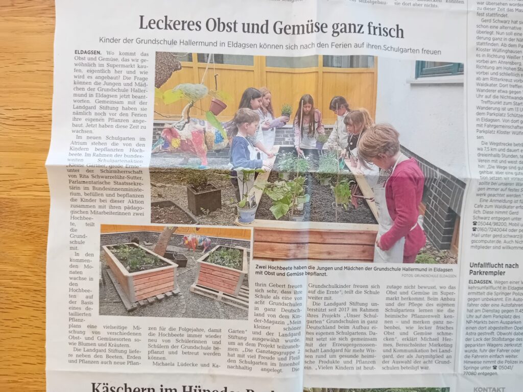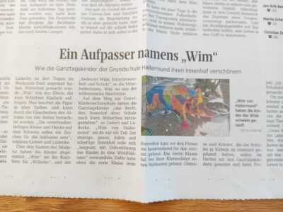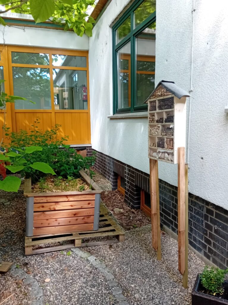 Aus unserem grauen steinigen Schulinnenhof gestalten die Ganztagskinder mit zwei pädagogischen Mitarbeiterinnen eine grüne, naturnahe, bienenfreundliche und nachhaltige Wohlfühloae.