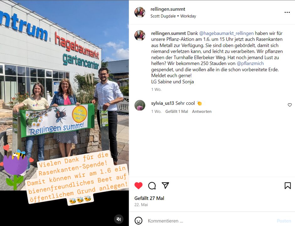 Seit und während dieses Wettbewerbes informieren wir über bienenfreundliches Gärtnern und Winterhilfen für Insekten auf Marktständen, unserer Instagram-Seite und arbeiten in enger Zusammenarbeit mit der Gemeinde und den lokalen Geschäften, um Sponsoren für Pflanzen, Werbeflächen und Flächen zum Bepflanzen zu bekommen. Jedes Jahr wollen wir seit Abschluss des Wettbewerbes 2023 nun 2-3 Pflanzaktionen durchführen zusätzlich zu Staudentauschaktionen und Informationsveranstaltungen.