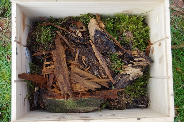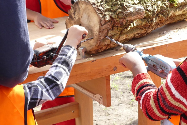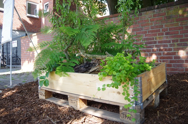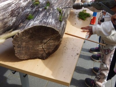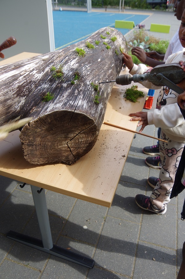 Alleine die Bezeichnung Totholz ist so irreführend wie nur irgendetwas. Hier wurden die Kinder zusätzlich zu den Pflanzungen mit einbezogen. Auf mehreren Spielplätzen und in einem Quartierzentrum wurden Bohraktionen mit den Kindern durchgeführt. Zum einen als Bienenhotels, zum anderen wurden in die Bohrungen Moose eingesetzt, und diese Stücke dann in die vorher mit den Kindern erstellten Beete eingebracht. Hilfreich war, den Kleinen den mobilen Waldgarten genauer zu erklären.