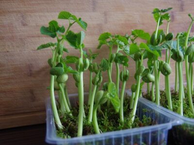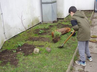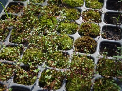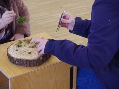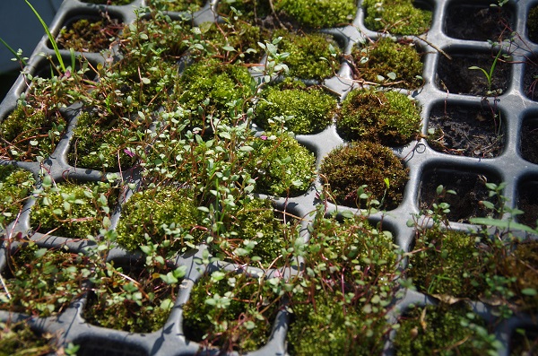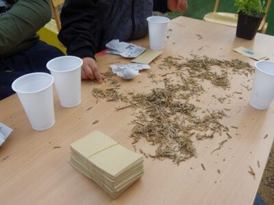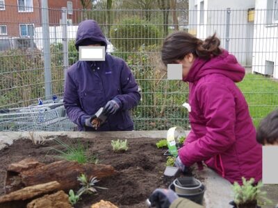 Vorbereitend für die weiteren Aktionen wurden verschiedene Anzuchttechniken ausprobiert. Ob Getreide in der Diskettenbox oder Thymian auf Moosbett: Es zeigte sich, dass die Anzucht mit Moosen gut gelang, die Saat dort nicht schimmelte und die „variable“ Gießtechnik der Kinder am besten überstand. Die Saat für die Speisepflanzen wurde als saatechte Varianten von Bingenheimer bestellt. Die Wildpflanzen gingen aus dem ehemaligen UN-Dekaden Projekt des Recycling-Hofs Findorff hervor. Sachspenden der KGV sowie Zwiebeln für die Frühblüher wurden am Recycling-Hof Findorff separat erfasst und werden im Herbst gesetzt.
