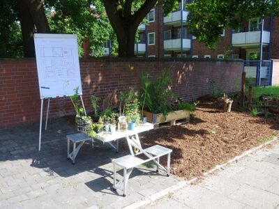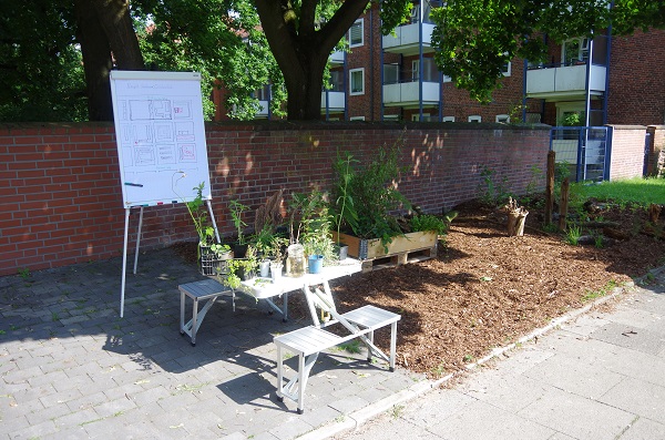 Also ein Problem, das hier im Wettbewerb jeder Teilnehmer kennt. Die Ansprache der Bewohner konnte wegen des Migrationsanteils von etwa 60 % locker über das Thema „essbare Stadt“ vermittelt werden. Aus Erfahrung lassen sich Urban Gardening-Projekte in solchen Stadteilen durch die Kenntnis aus den Heimatländern problemlos umsetzen.