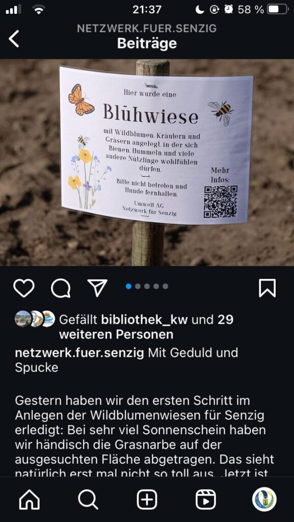 Unser Artikel zur Anlage der ersten Wildblumenwiese in Senzig, der so ähnlich auch im „Dein Senzig Magazin“ erschienen ist: https://www.netzwerk-senzig.de/2024/04/30/erste-wildblumenwiese-fuer-senzig/