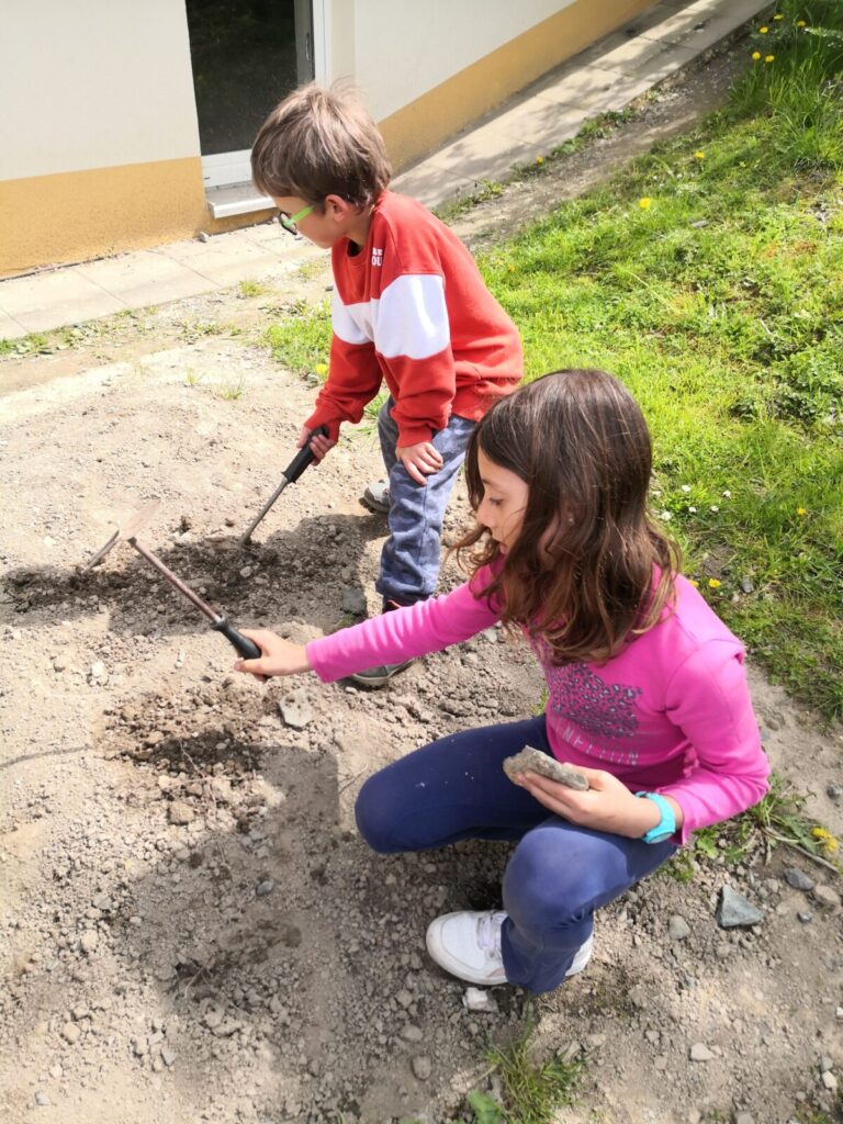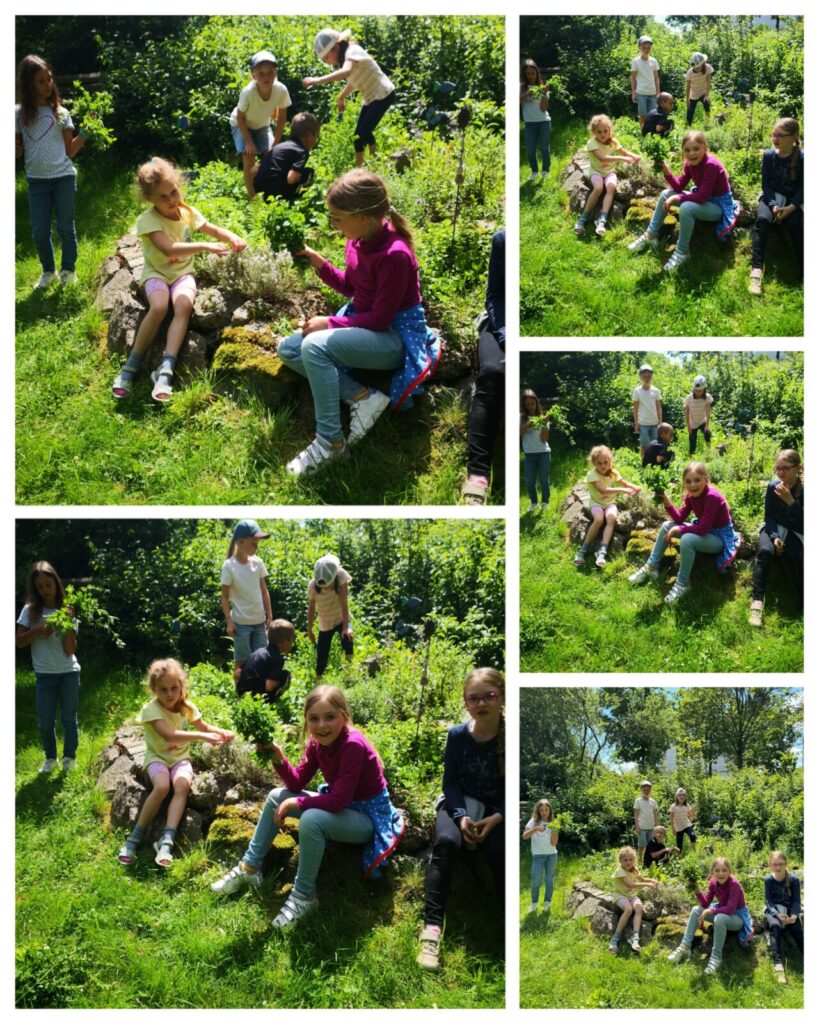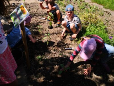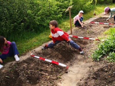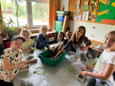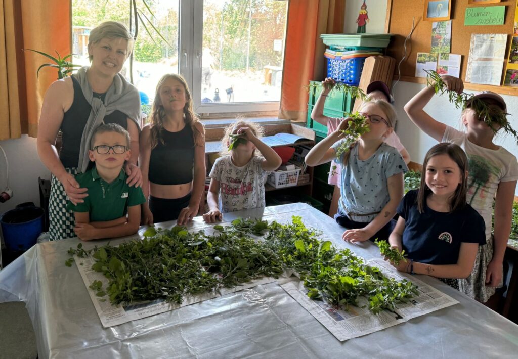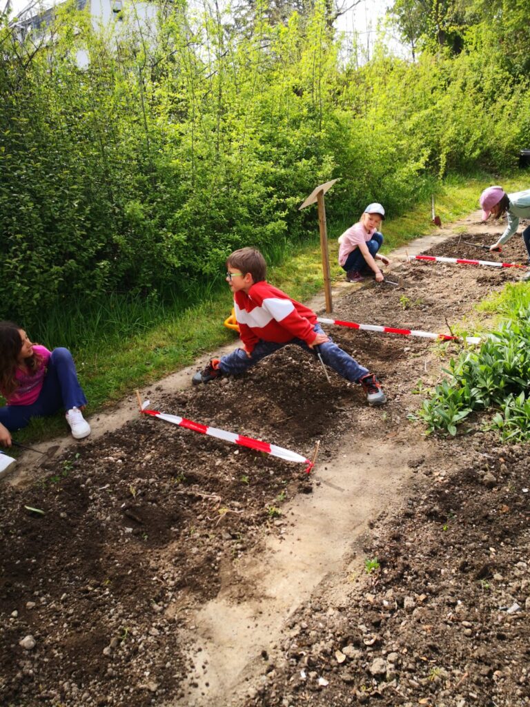 Gemeinsam mit ihrer Lehrerin Frau Stengel und der Schulgarten-Patin Frau Winkler wollen sie ein Beet mit Wildblumen anlegen, um vielen Insekten einen Lebensraum und einen Rückzugsort zu geben.