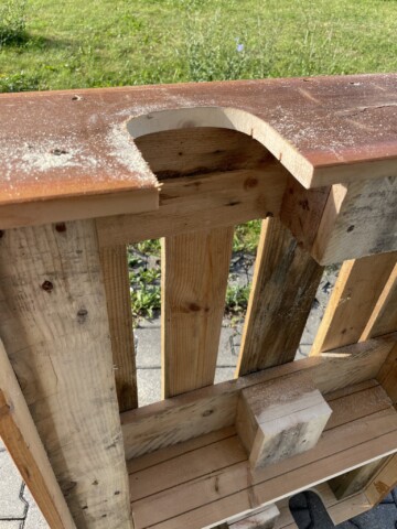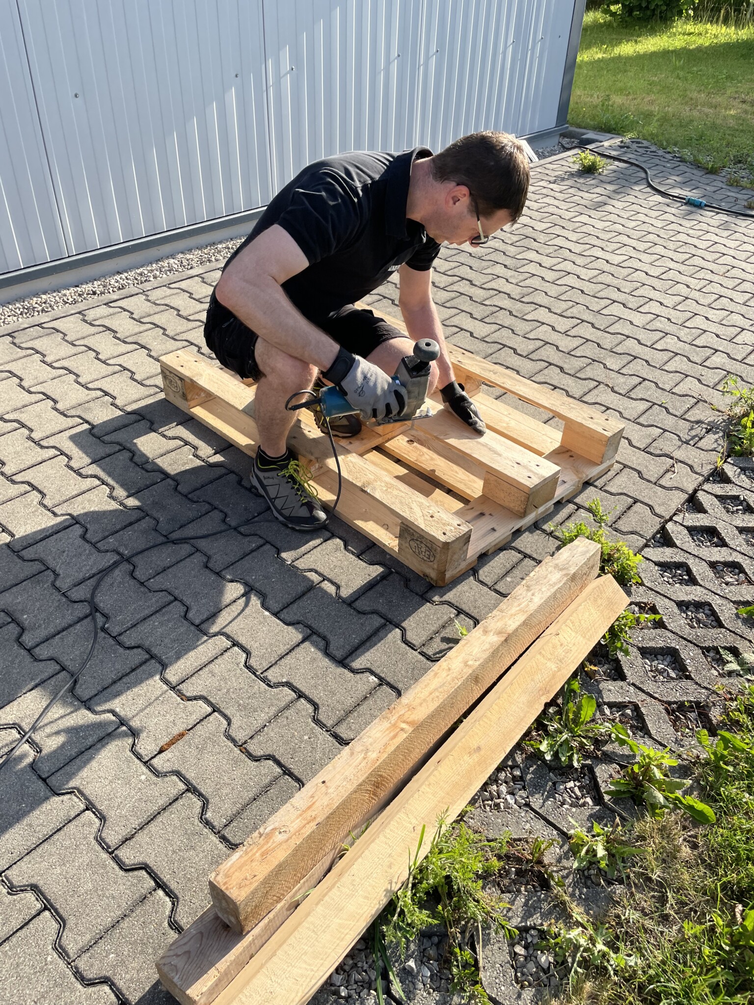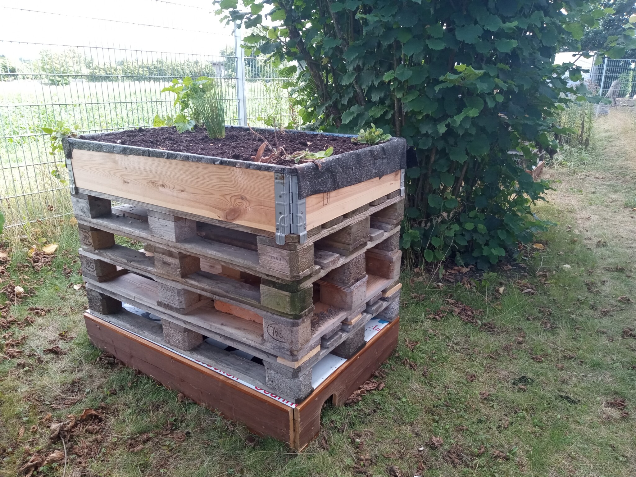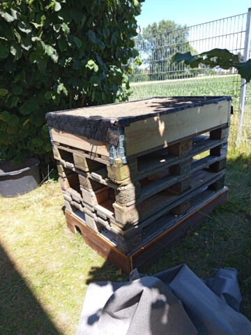 Wir haben auf unserem Firmengelände aus Paletten zwei „Mehrfamilienhäuser“ gebaut.
