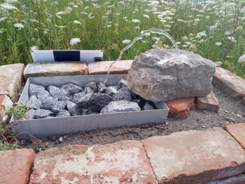 Ganz oben befindet sich genug Wasser für Insekten, Vögel usw. Eine Solarbetriebene Pumpe hält das Wasser stets frisch. Die Steine sorgen für ein gefahrloses Trinken für die Insekten.