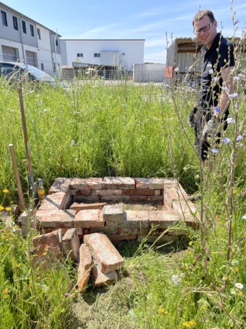 Die Steine speichern Wärme von der Sonne, ideal für Eidechsen. Im Sandarium können Wildbienen nisten.