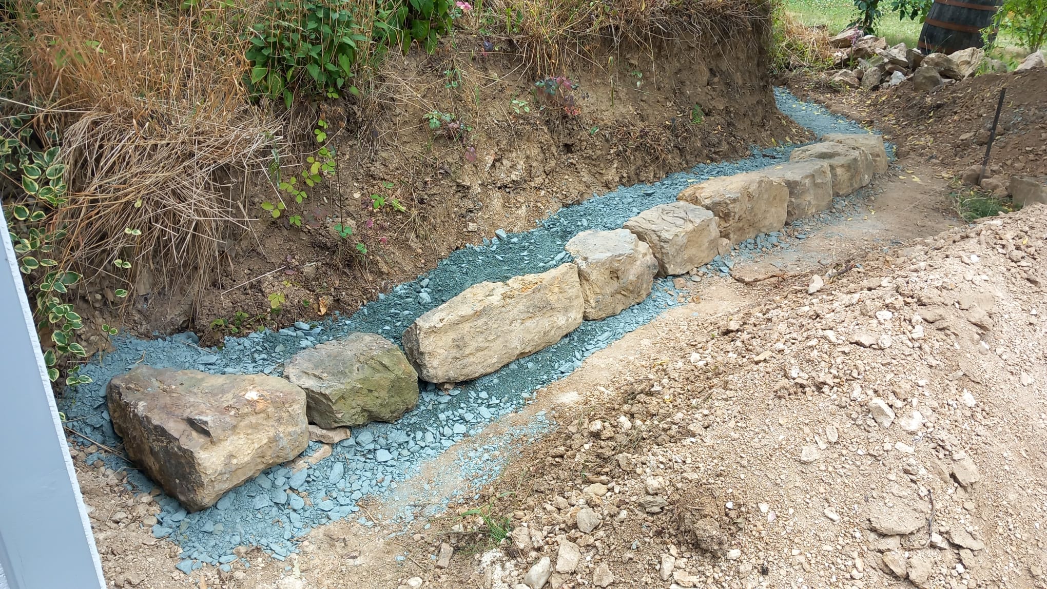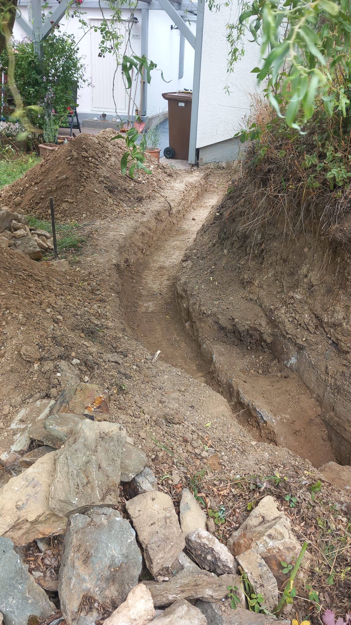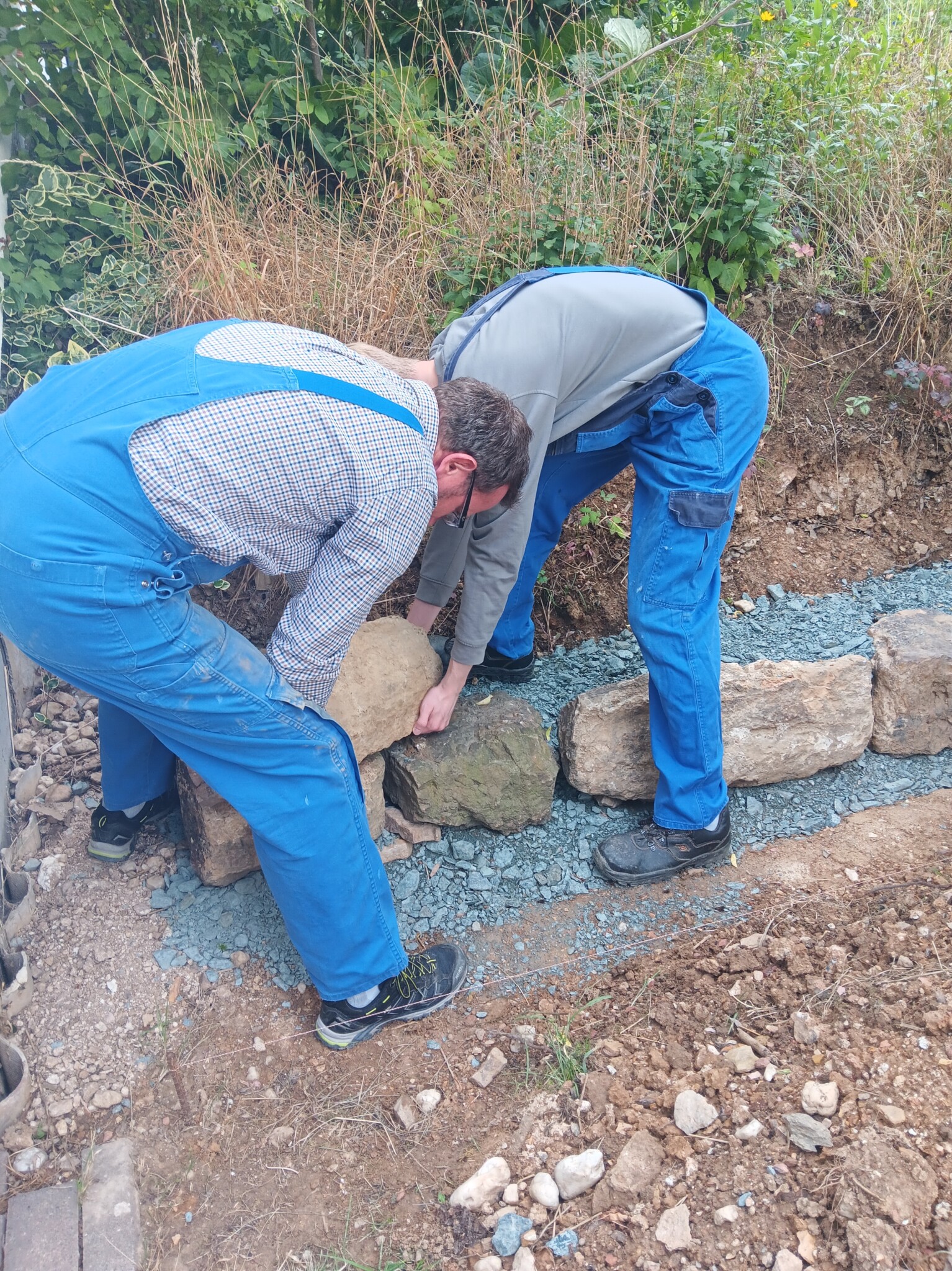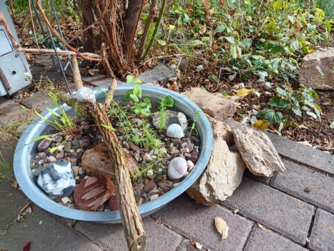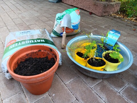 2021 haben wir begonnen, unseren Garten schrittweise zum Naturgarten umzugestalten. Beim Kauf des Hauses dominierten – noch von den Vorbesitzern angepflanzt – eine riesige Thuja-Monster-Hecke, zahlreiche Kirschlorbeerbüsche und eine Terrassen-Einfassung aus Eisenbahnschwellen unseren Garten, in dem ansonsten kaum etwas blühte. Die Kirschlorbeerbüsche entfernten wir direkt nach dem Einzug, danach war erstmal länger Pause im Garten wegen Hausumbau und Familiengründung. 2021 ging es dann mit ersten größeren Projekten wieder los, damals nahmen wir schonmal am Wettbewerb teil (“Auf dem Weg zum Naturgarten“). Wir legten unter anderem einen Totholzhaufen, einen Miniteich, einen ersten Gemüsegarten und blühende Beete mit zahlreichen heimischen Pflanzen an. Den Gemüsegarten vergrößerten wir in den Folgejahren schrittweise zum Bauerngarten mit Mischkultur und vielen blühenden Strukturen. Unser aktuelles Projekt haben wir Ende 2023 / Anfang 2024 in Angriff genommen. Schrittweise entfernen wir die Thujahecke und die Eisenbahnschwellen und ersetzen die Hecke durch Buchenhecken und Wildobsthecken mit Staudensaum. Die Terrasse und das zugehörige Beet fassen wir mit Trockenmauern aus Bruchsteinen von Abbruchhäusern aus unserem Wohnort ein. Auch eine Benjeshecke legen wir an, damit außer dem Thujarückschnitt möglichst alles im Garten verbleiben kann. Die Wettbewerbsfotos zeigen die Flächen, die seit Herbst 2024 neu gestaltet wurden.