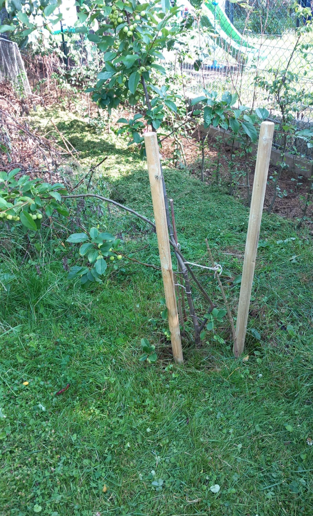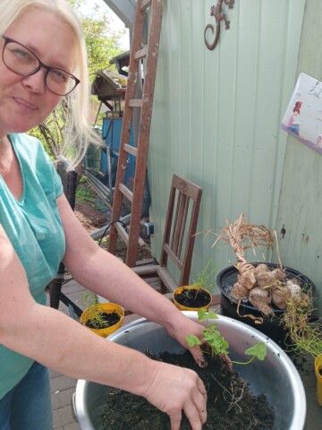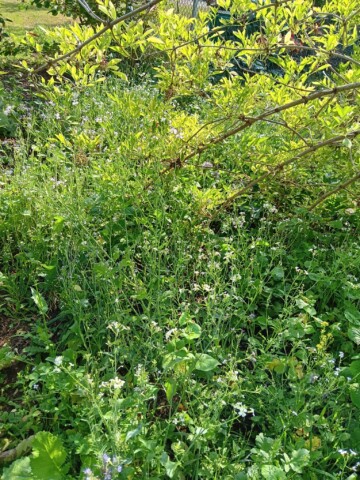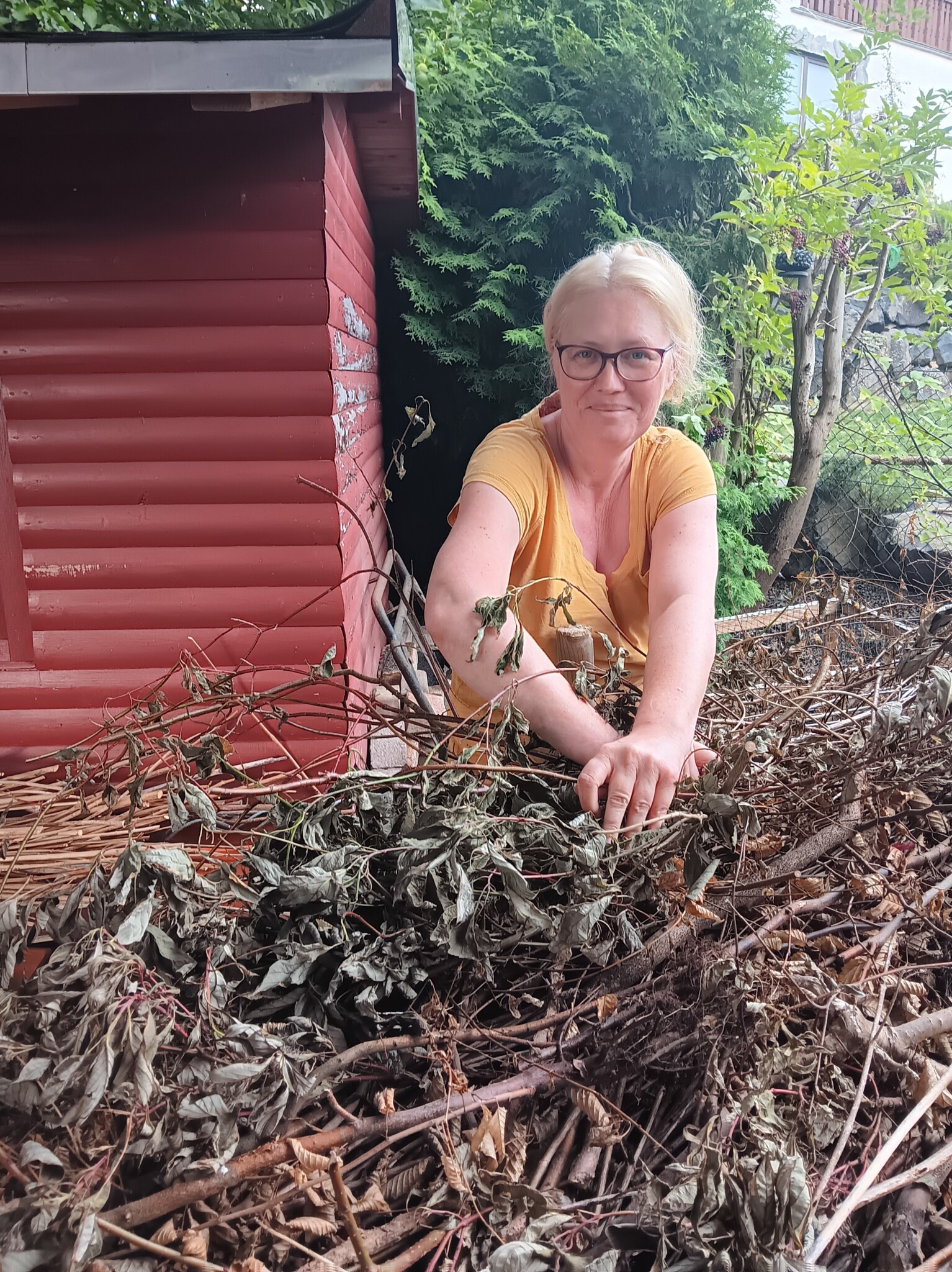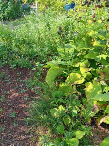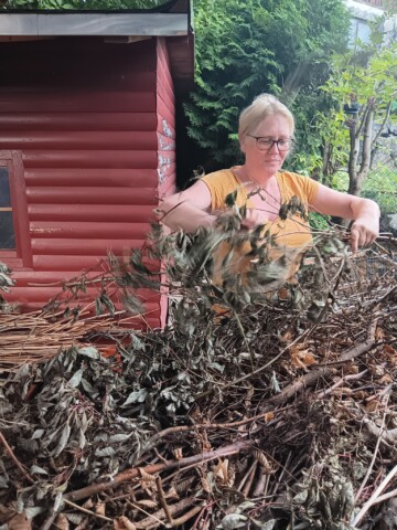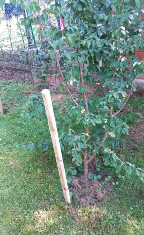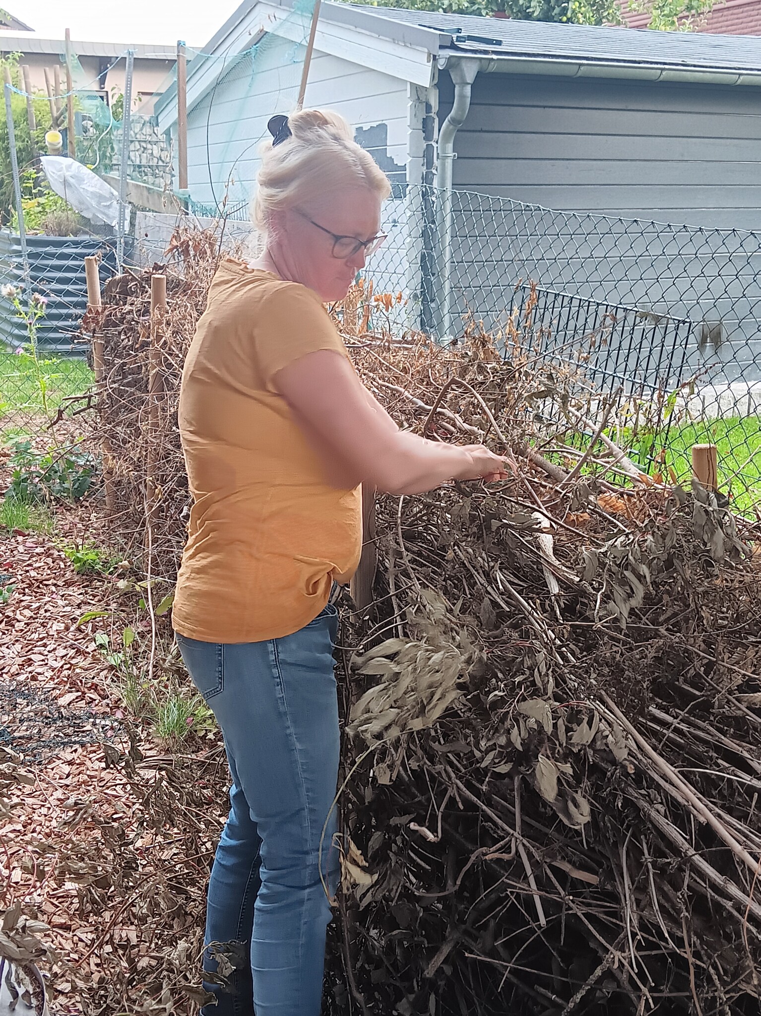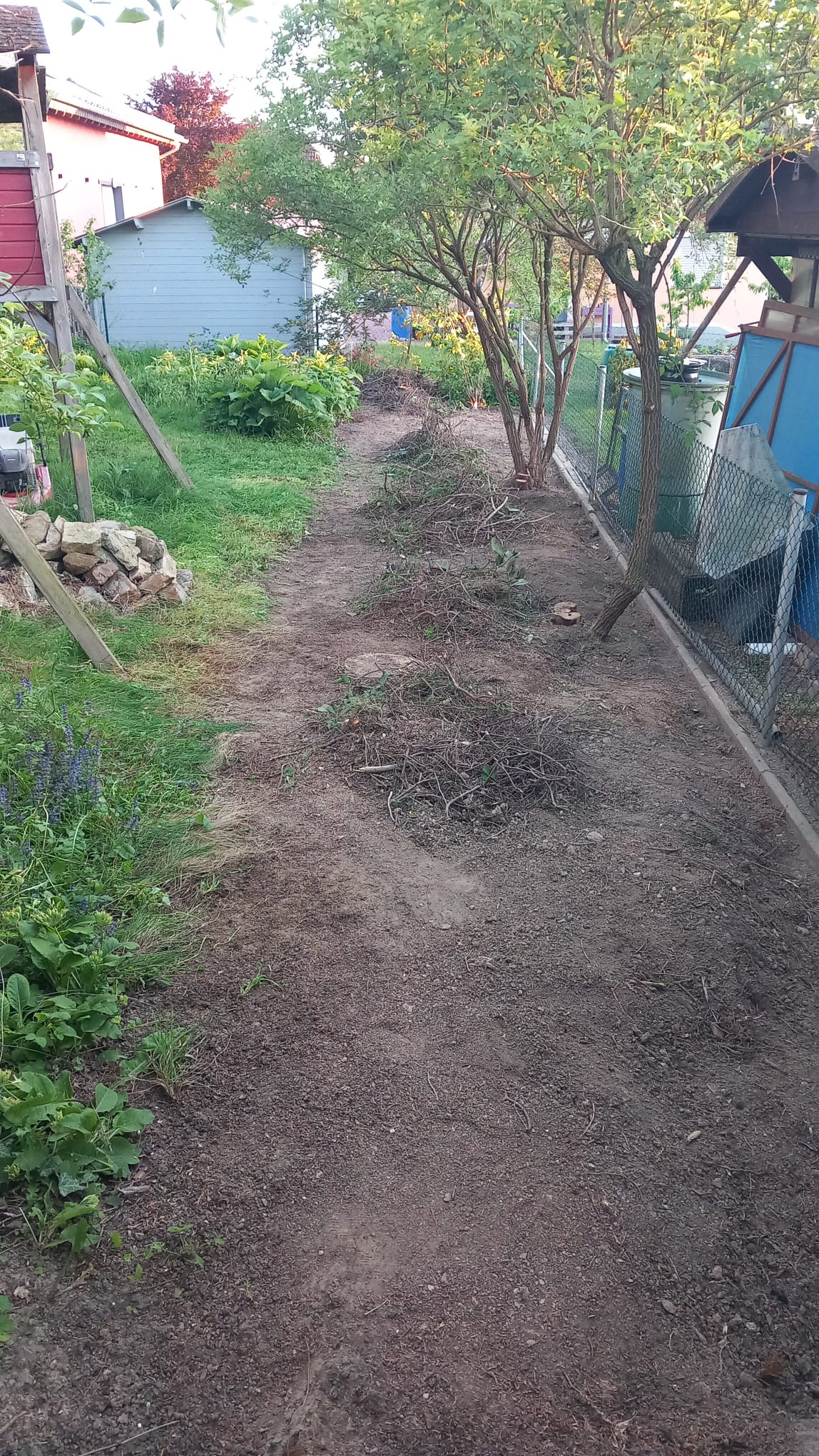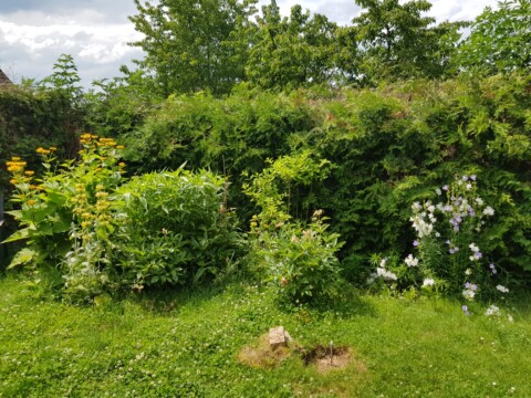 Wir pflegen unseren Garten selbst. Bei größeren Arbeitseinsätzen bitten wir die Kinder um Unterstützung, wenn z.B. größere Mengen Strauchschnitt weggetragen werden müssen. Um die regelmäßige Pflege des Gartens kümmern mein Mann und ich uns. Die Pflege des Bauerngartens ist hauptsächlich mein Bereich. Ich gieße möglichst selten, aber dann durchdringend. So bilden die Pflanzen längere und tiefer gehende Wurzeln und geraten nicht so schnell in Trockenstress. Stauden, Bäume und Blühstreifen im Naturgarten werden aus dem gleichen Grund nur gegossen, wenn sie erkennbar Wasser benötigen. Den jetzt neu angelegten Blühstreifen werden wir im Herbst in den Boden einarbeiten zur Bodenverbesserung. Die Fläche soll dann noch mit weiteren heimischen Sträuchern und Stauden bepflanzt werden. Im Bauerngarten werden alle Flächen gemulcht, um Beikräuter zu unterdrücken, wo sie stören würden, und natürlich um den Boden feucht zu halten. Im Naturgarten ebenso, bzw. pflanzen wir entsprechend dicht.