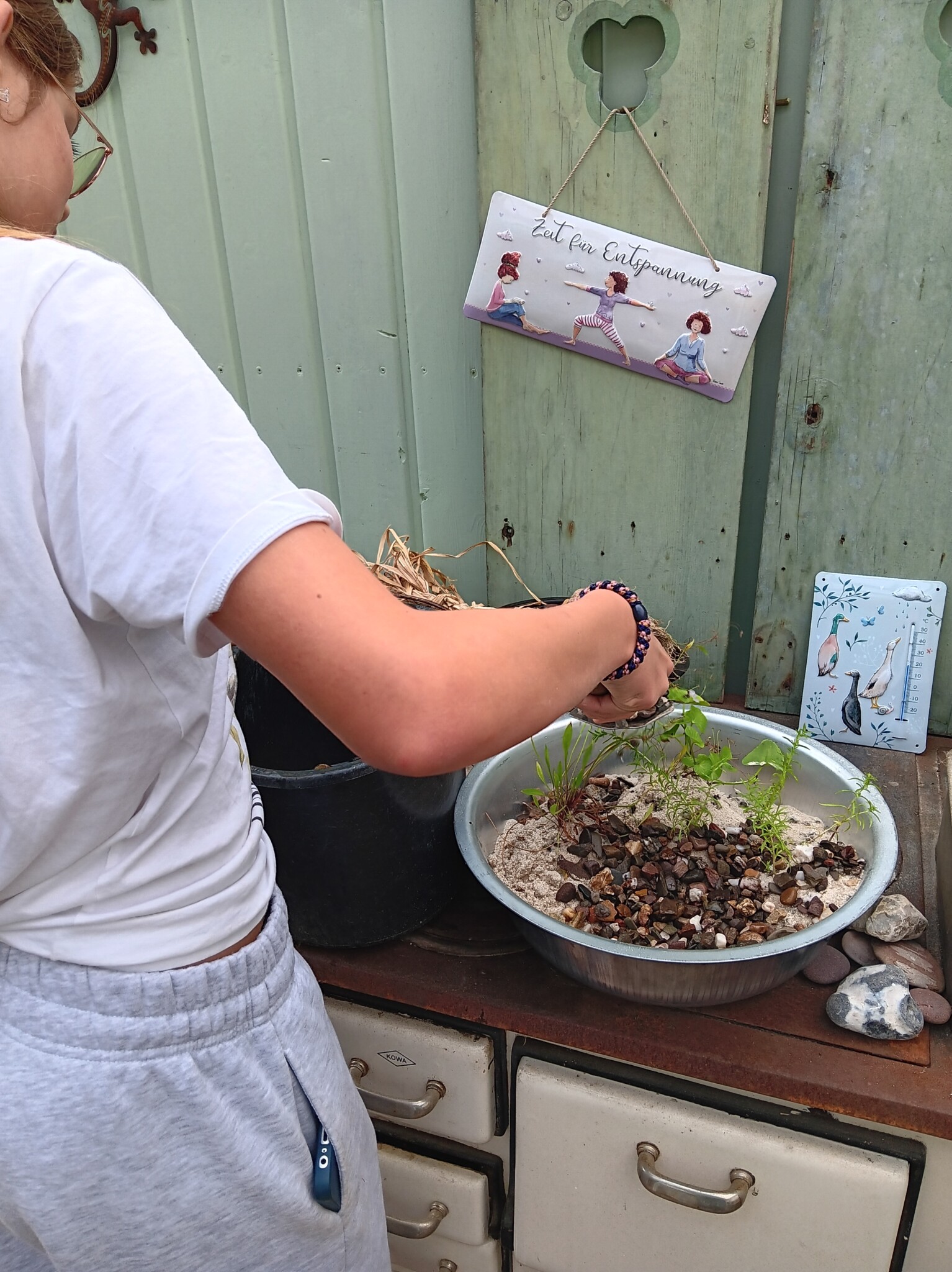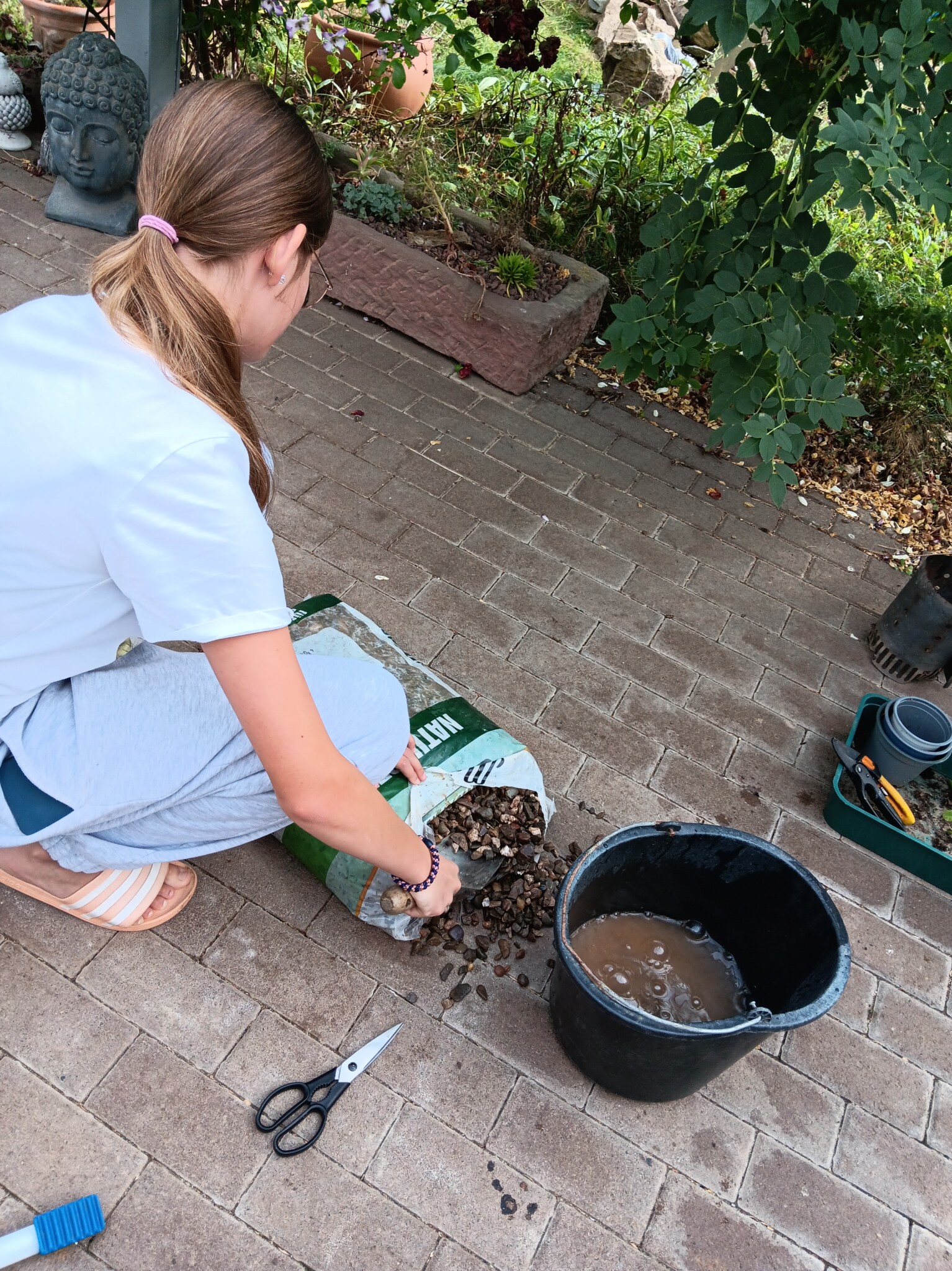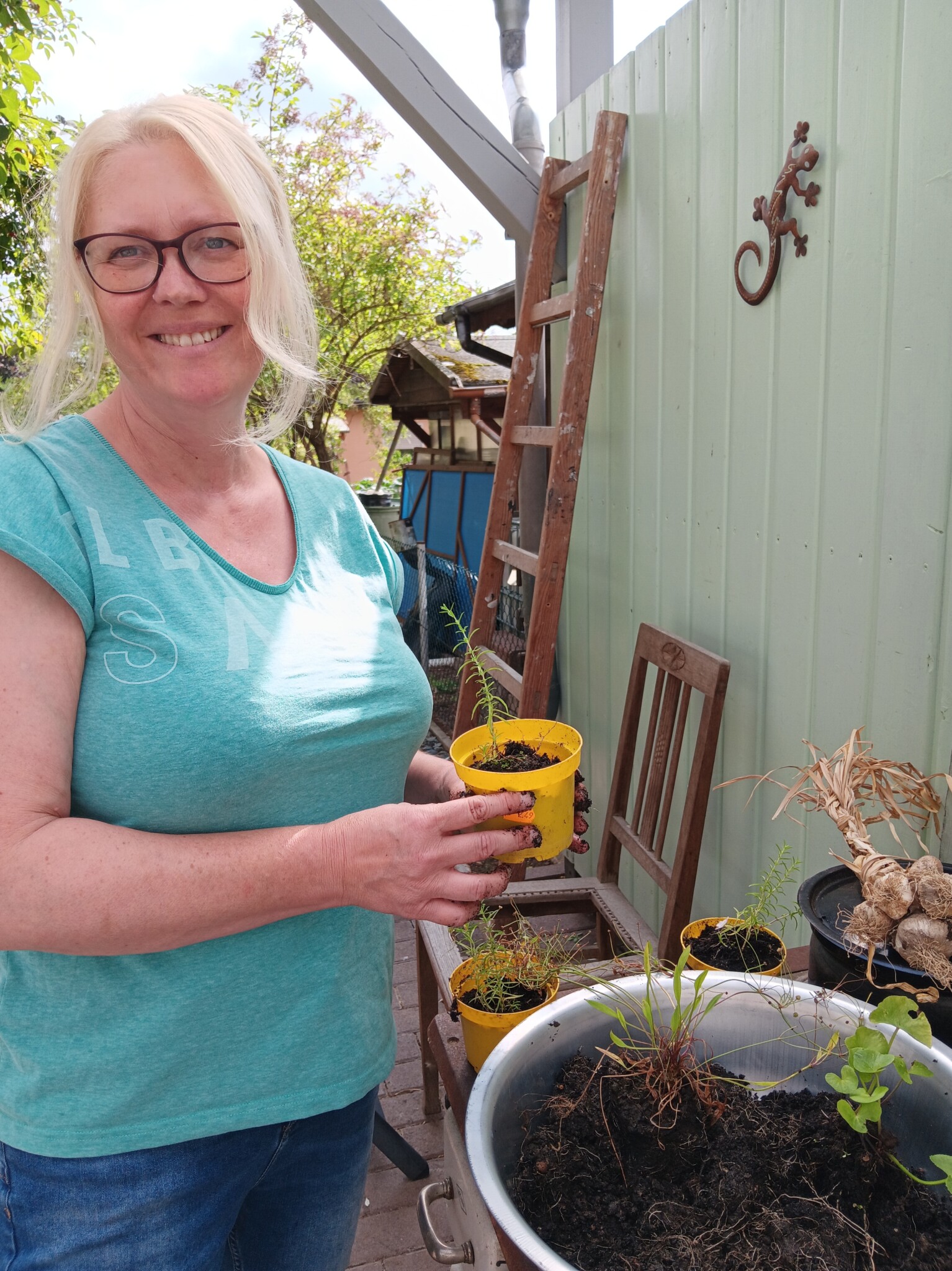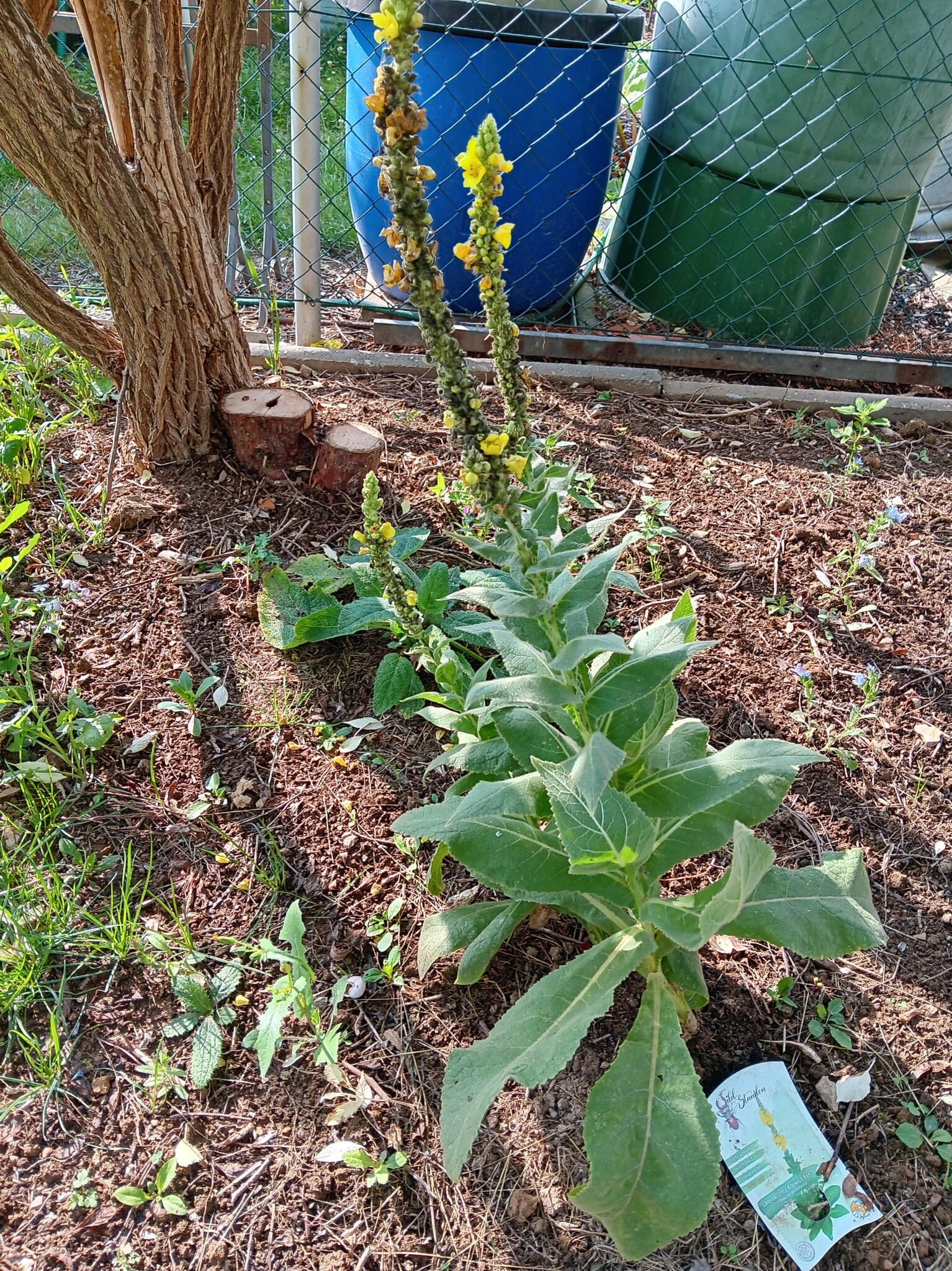 Wir pflegen unseren Garten selbst. Bei größeren Arbeitseinsätzen bitten wir die Kinder um Unterstützung, wenn z.B. größere Mengen Strauchschnitt weggetragen werden müssen. Um die regelmäßige Pflege des Gartens kümmern mein Mann und ich uns. Die Pflege des Bauerngartens ist hauptsächlich mein Bereich. Ich gieße möglichst selten, aber dann durchdringend. So bilden die Pflanzen längere und tiefer gehende Wurzeln und geraten nicht so schnell in Trockenstress. Stauden, Bäume und Blühstreifen im Naturgarten werden aus dem gleichen Grund nur gegossen, wenn sie erkennbar Wasser benötigen. Den jetzt neu angelegten Blühstreifen werden wir im Herbst in den Boden einarbeiten zur Bodenverbesserung. Die Fläche soll dann noch mit weiteren heimischen Sträuchern und Stauden bepflanzt werden. Im Bauerngarten werden alle Flächen gemulcht, um Beikräuter zu unterdrücken, wo sie stören würden, und natürlich um den Boden feucht zu halten. Im Naturgarten ebenso, bzw. pflanzen wir entsprechend dicht.