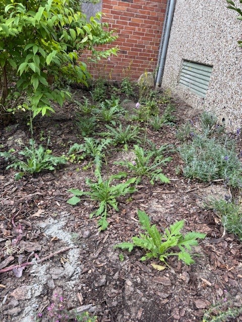 Beet Nummer 1 nach der Bepflanzung. Die Pflanzen sind noch deutlich im Wachstum, sind aber am wurzeln und wachsen.