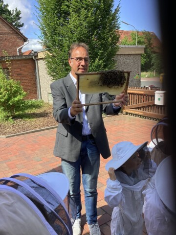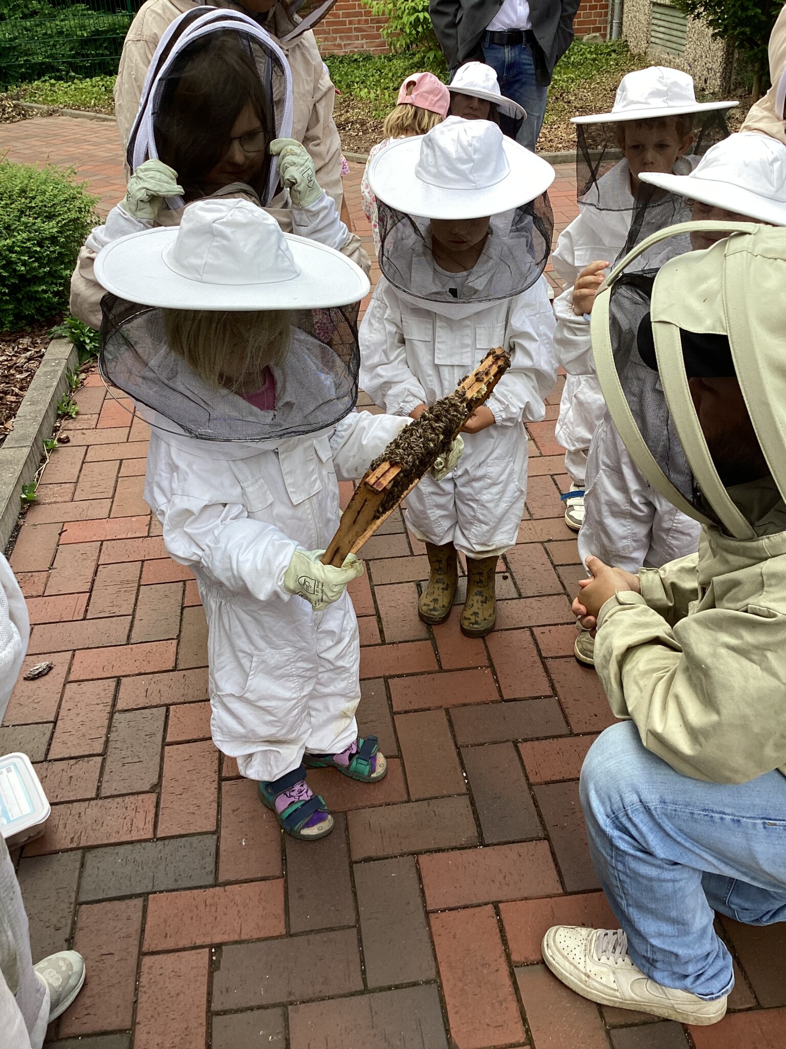 Alle Kinder der Kita wurden in 3 Gruppen aufgeteilt und durften neben der Pflanzaktion und dem Bau von Wildbienenhotels und Saatkugeln, auch die Honigbienen begutachten. Sie durften Waben halten, Honig probieren und die 3 Bienenwesen kennenlernen.