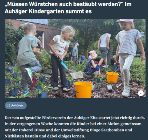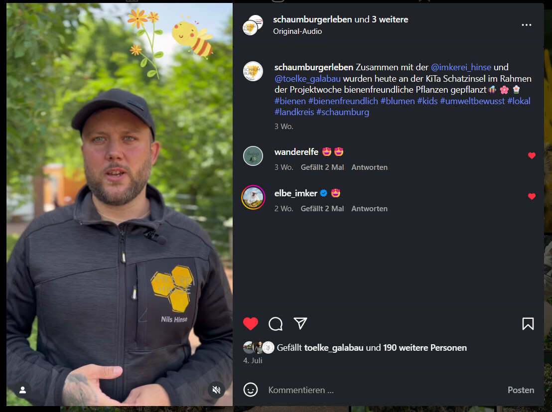 Imkerei Hinse hatte eine Woche lang Honigbienen vor Ort, die sich die Kinder genau angeschaut haben. Hagebaumarkt Stadthagen (Sponsoring von Frühblühern), Gartenbau Tölke (Begleitung bei der Pflanzaktion und Anschaffung der Stauden), Förderverein des Kindergartens (Initiator der ganzen Aktion), Eiscafe Classico aus Lindhorst (Sponsoring Eis beim Pflanztag), Sägewerk Alder (Sponsoring Holz für Wildbienenhotel).