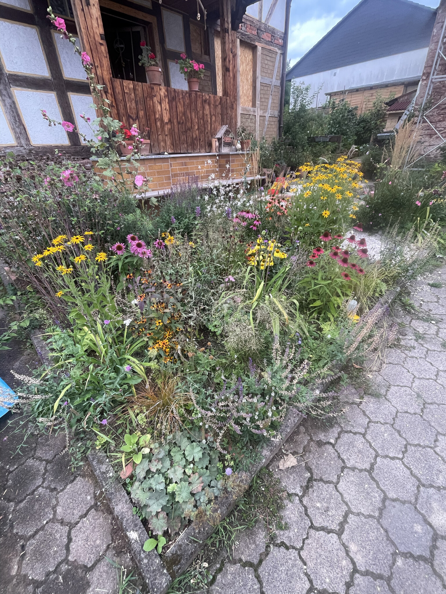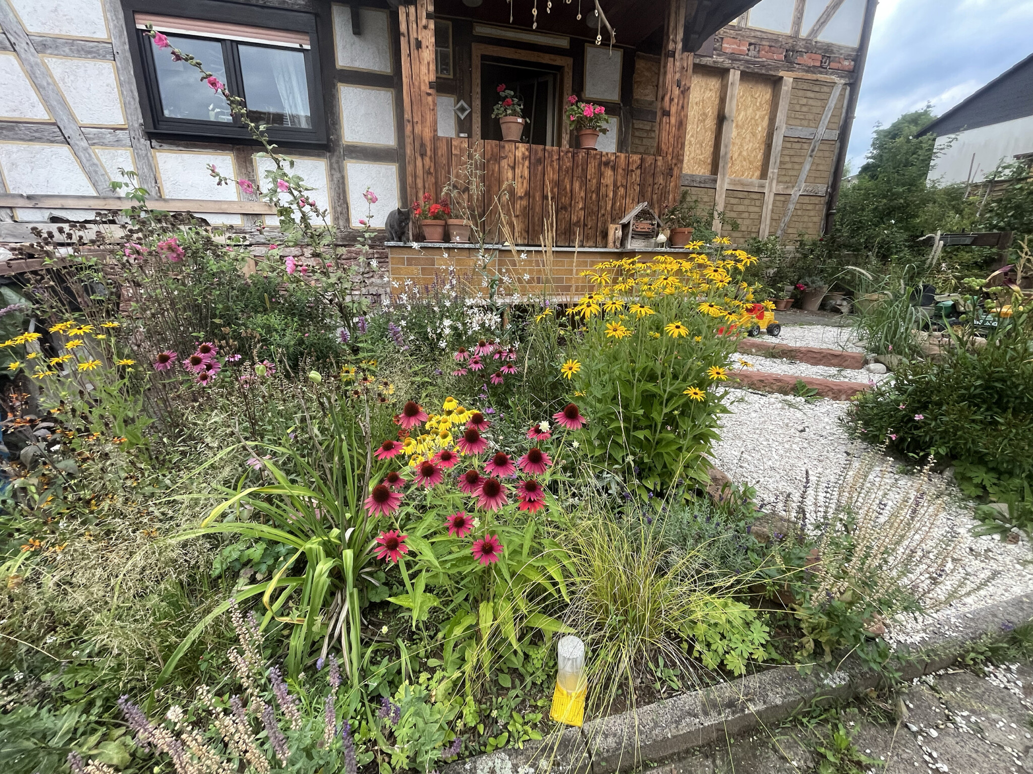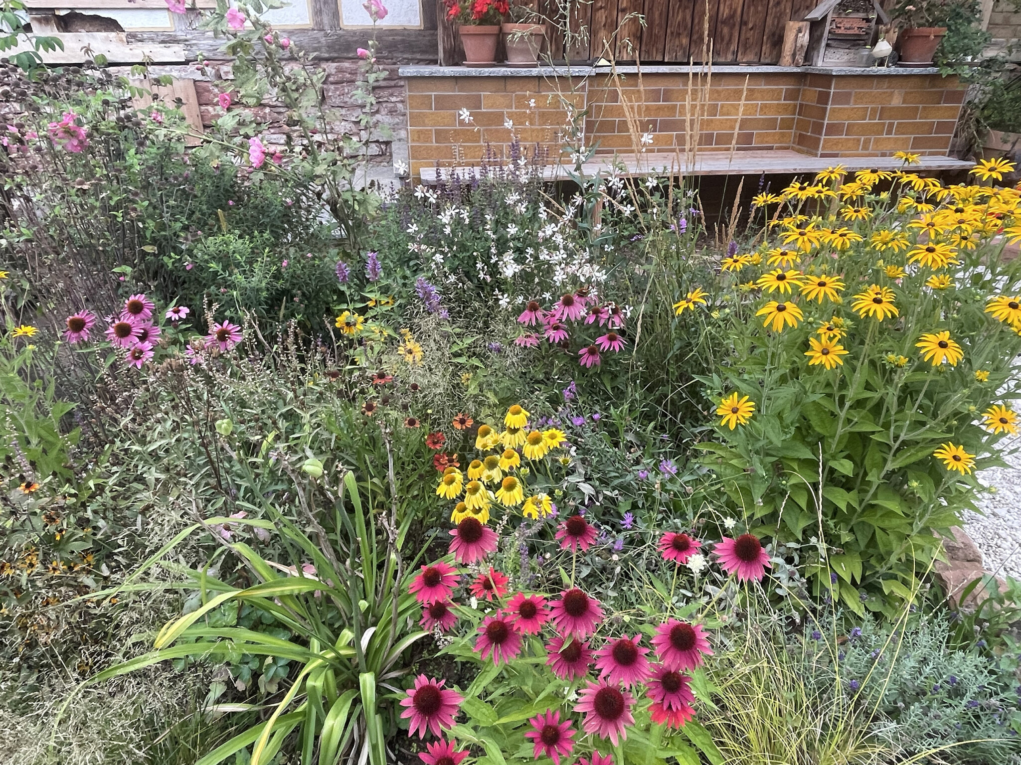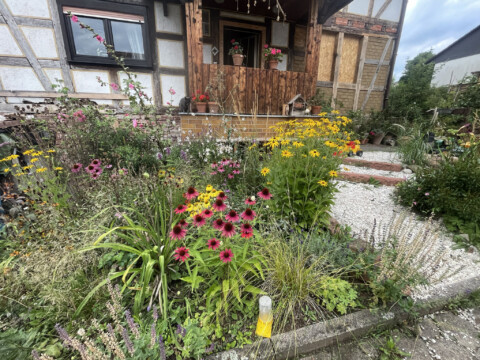 Am liebsten sitzen wir auf der Bank direkt vor dem Haus – mitten im Blumenmeer. Um uns herum summt und brummt es, es flattert und zirpt. Ein Ort für alle Sinne – ein Stück Wohlfühl-Natur, das wir mit viel Schweiß, Hingabe und Herz geschaffen haben.
