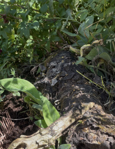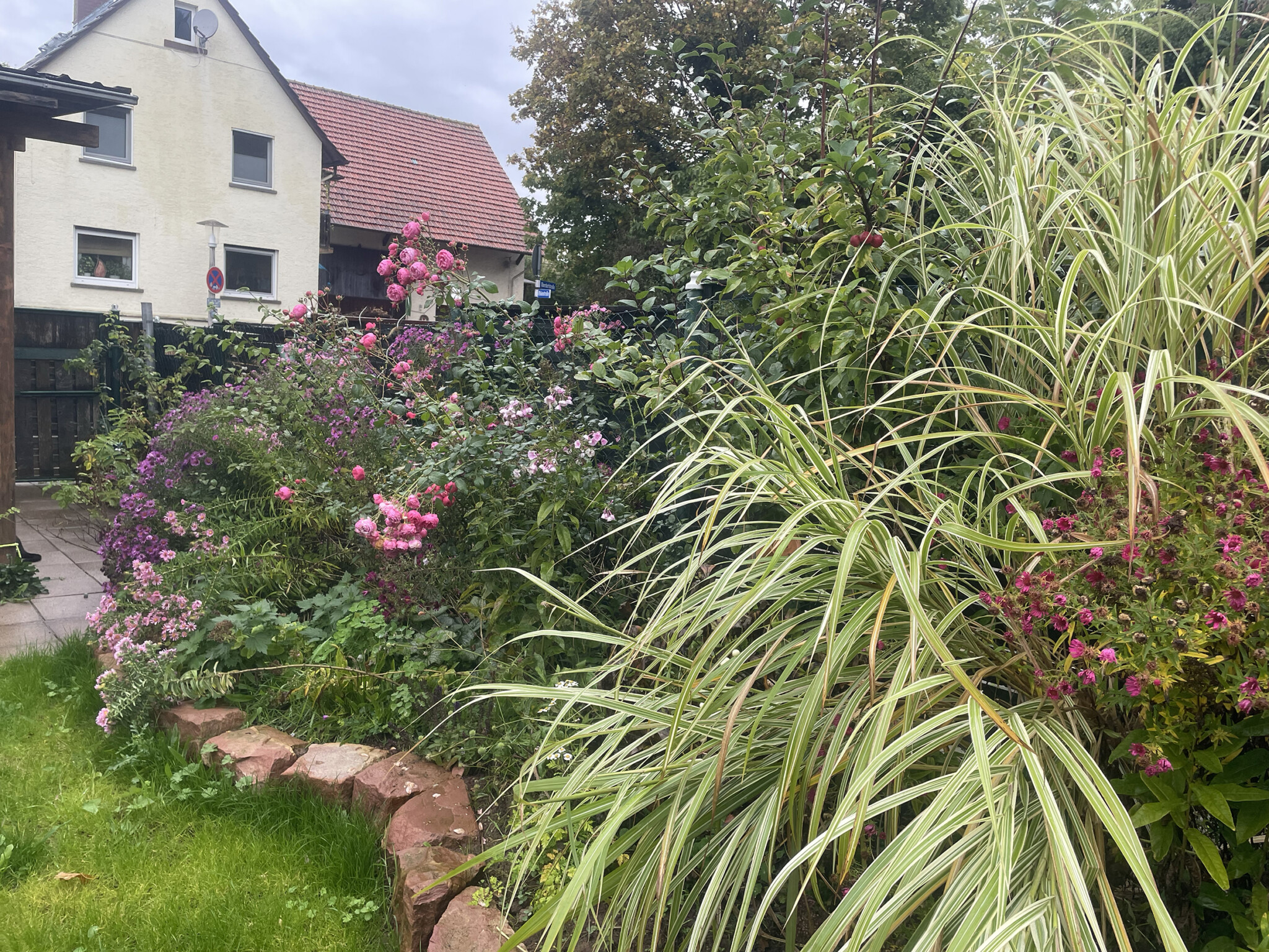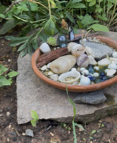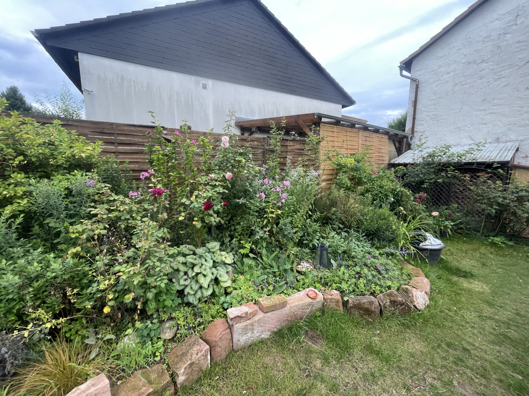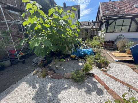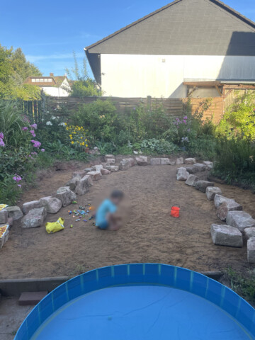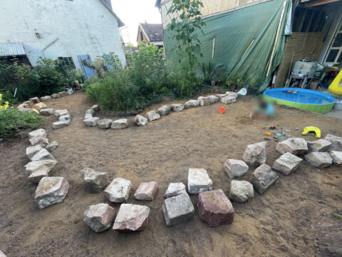 Doch das war erst der Anfang. Tonnenweise Natursteine wurden herbeigeschafft – teils aus Abrisshäusern, teils aus Kleinanzeigen. Ein ganzer Berg aus Granit bildet heute unsere „Wilde Ecke“. Dort wachsen Brennnesseln in voller Pracht – ein wahres Schlaraffenland für Raupen und Schmetterlinge. Der Sandstein bildet den Übergang von der Wiese zum Blumenbeet, da können wir sitzen und balancieren. Einige andere wurden einfach zu Treppen.