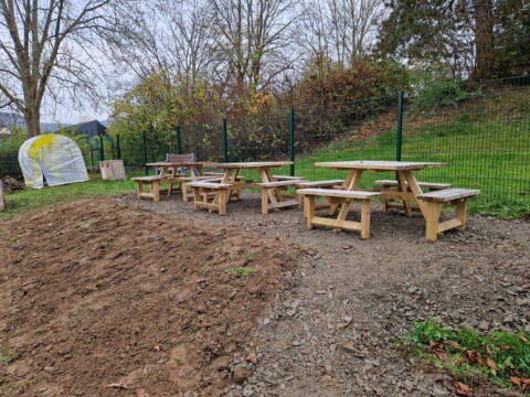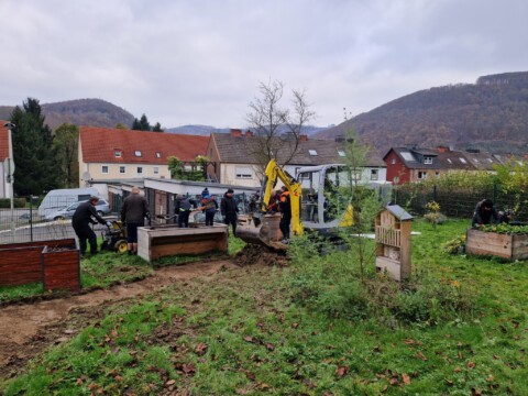 Mit Hilfe von Eltern, Nachbarschaft und Firmen haben wir den Garten nochmals umstrukturiert so dass wir im Februar wieder vor einer großen Baustelle standen. Die Hochbeete wurden umgestellt um mehr Platz zu schaffen, es mussten Rollator und Rollstuhlgerechte Wege her. Der Erdaushub kam dann erstmal in eine Ecke. Das grüne Klassenzimmer musste begradigt werden und auch das waren massive Erdarbeiten. Ich habe zwischendurch echt gedacht, dass war es mit der grünen Bienenoase. Unser Garten sah aus wie ein Schlachtfeld.
