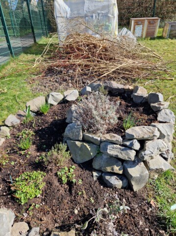 Unser Lesesteinhaufen mit den großen Schneckenhäusern und die Natursteinmauer als Kräuterspirale sind geblieben bzw. erweitert worden