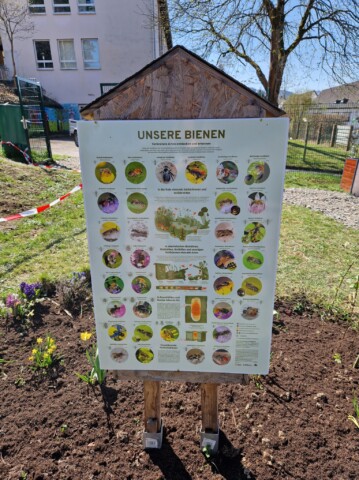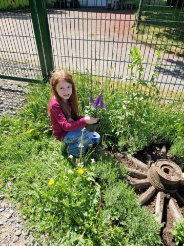 In unseren Beeten stehen überall selbstgebastelte Insektentränken und an den Bäumen haben wir selbstgebaute Ohrenkneiferhotels. Unser Garten ist mittlerweile autark, wenn wir kurze Stücke mähen ( nur noch die Wege, kein ganzes Grundstück mehr, damit die Wiese mehr Möglichkeiten hat zu wachsen), dann mit einem Elektrorasenmäher den wir mit Solarenergie von einer gespendeten kleinen Photovoltaikanlage (Dank des vollen Einsatzes eines Vaters) auf unserem Gartenhaus, speisen. Das Gießwasser bekommen wir aus Regentanks, die an die Regenrinnen der Schulen angeschlossen sind. Dies war alles ist nur durch den unermüdlichen Einsatz unserer Nachbarschaft und Eltern möglich, die sich so für dieses Projekt begeistern.