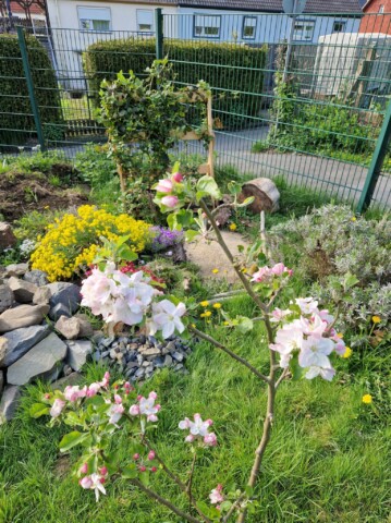 Für das Frühjahr hatten wir letztes Jahr im Oktober jede Menge Frühblüher gepflanzt um frühzeitige ein Nahrungsangebot zu bieten. Dazu kam jetzt im Frühjahr noch eine kleine Sal Weide, ein Holunderbusch und Kirschbäume.