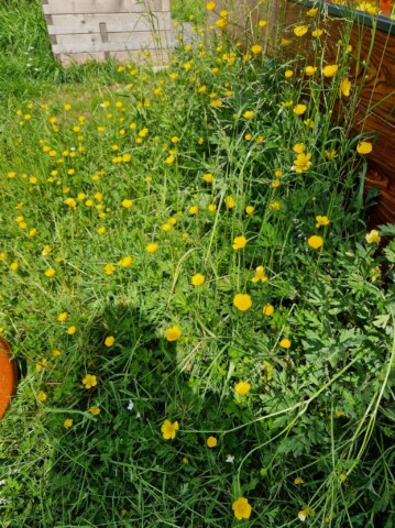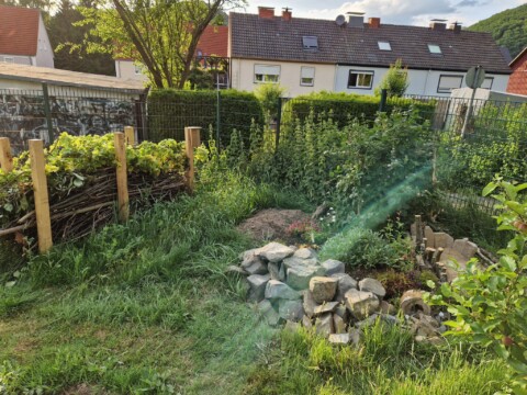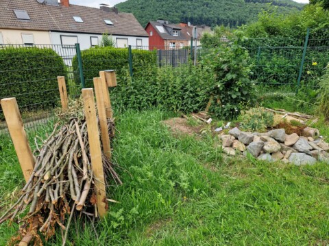 Natürlich haben wir auch dieses Jahr wieder an der Aktion mähfreier Mai teilgenommen.. Entlang des Zauns haben wir auf einem Streifen von ca. 30cm Breite das Gras stehen gelassen, vor allem auch die Brennesseln. Den Garten bzw. die Beete haben wir erst “aufgeräumt“ als es längere Zeit keinen Frost mehr gab, was im Sauerland recht schwierig war. Letzten Herbst hatten wir Reisighaufen angelegt und alle Blütenstängel stehen gelassen um den Insekten eine Überwinterung im Garten zu ermöglichen.