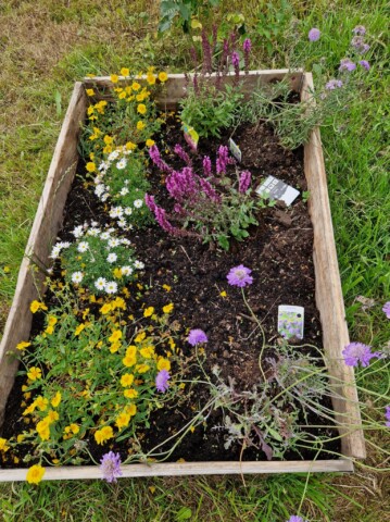 Projekt 5: Ein Beet angelegt, mit einigen heimischen Blühpflanzen direkt neben der Benjeshecke. Inklusive Infotafel, damit die Besucher lesen können, warum heimische Pflanzen so wichtig sind.