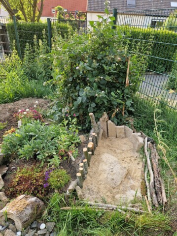 Projekt 8: In unserem Wildwuchs und Totholzbereich mit dem Sandarium gibt es jetzt eine große Brombeerhecke damit die trockenen Stängel nachher als Nisthilfe genutzt werden können