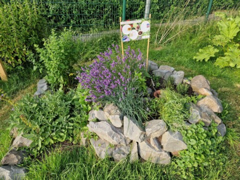 Projekt 6: Heimische Kräuter und insektenfreundliche Pflanzen. Zusätzlich zum Herbaria Kräuterpaket sind auf einer Fläche von ca. drei mal zwei Meter unsere Wilden Talente mit samt Infotafel eingezogen. Wir haben ein Extrabeet für die wilde Möhre, den Rainfarn, Wirbeldost, Gundermann, Wegwarte, Scheuchzer Teufelskralle, Lichtnelke und noch viele Pflanzen mehr von den Wilden Talenten angelegt. Von Gartenbau Born haben wir dafür extra Infotafeln erhalten um die Besucher über die Nützlichkeit dieser Kräuter zu informieren