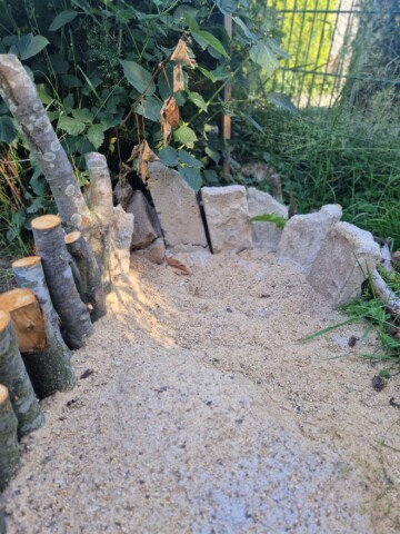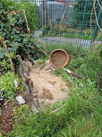 Projekt 4: Wir haben selbst senkrechte Lehm Sandwände gebaut, damit Bienen eine Möglichkeit bekommen, ihre Nester in diesen Bereich zu bohren bzw. zu bauen. Ein Teil davon steht direkt in unserem vergrößerten Sandarium, ein Teil in einem großen Tongefäß in der Nähe.