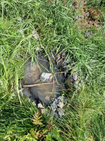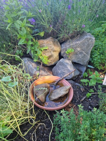 Projekt 7: Zusätzlich zu den Insektentränken die überall verteilt bei uns im Garten stehen, haben wir noch eine etwas größere Tränke in der Nähe der Bienenoase gebaut.