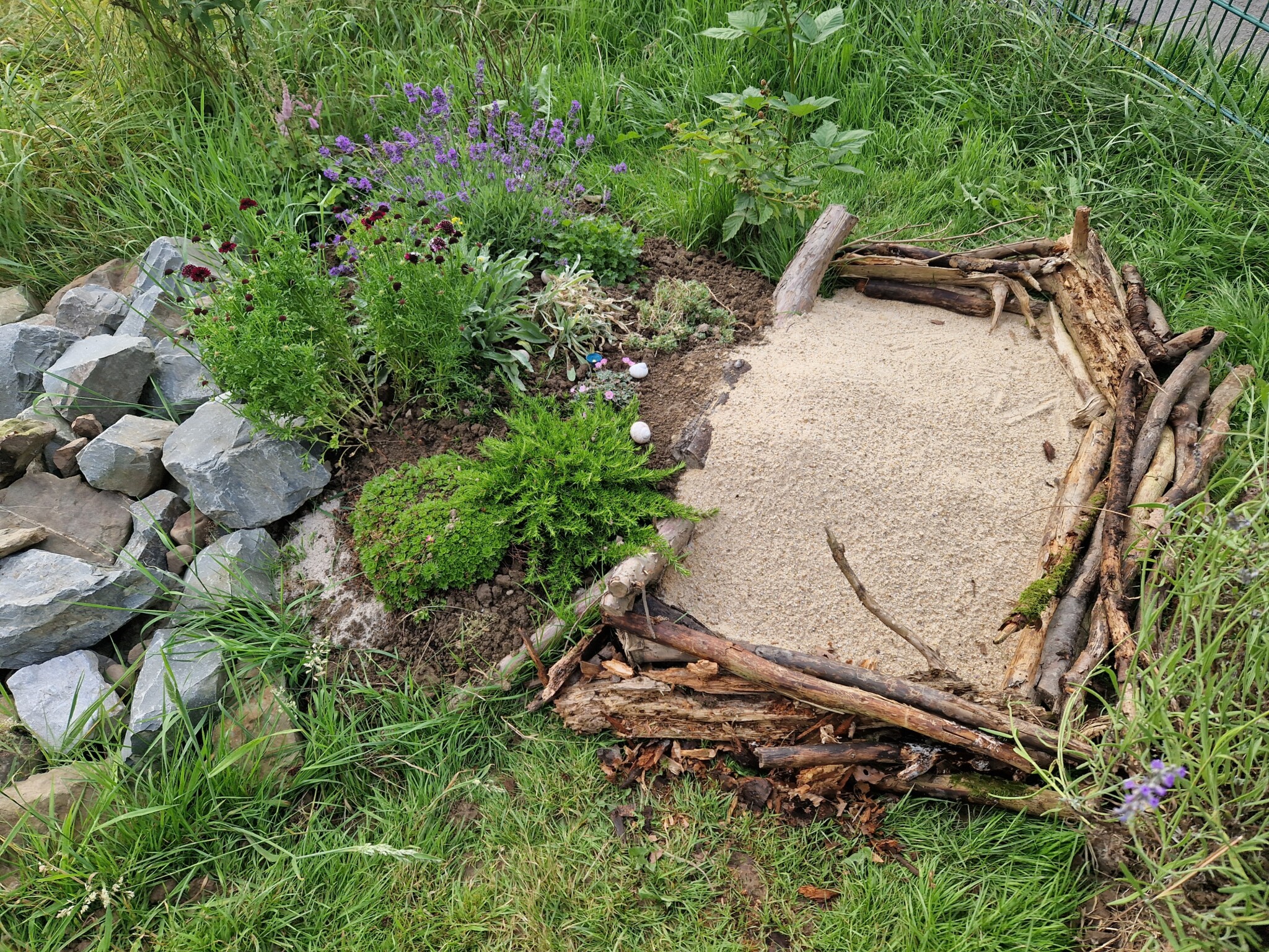 Projekt 5: Ein Beet angelegt, mit einigen heimischen Blühpflanzen direkt neben der Benjeshecke. Inklusive Infotafel, damit die Besucher lesen können, warum heimische Pflanzen so wichtig sind.