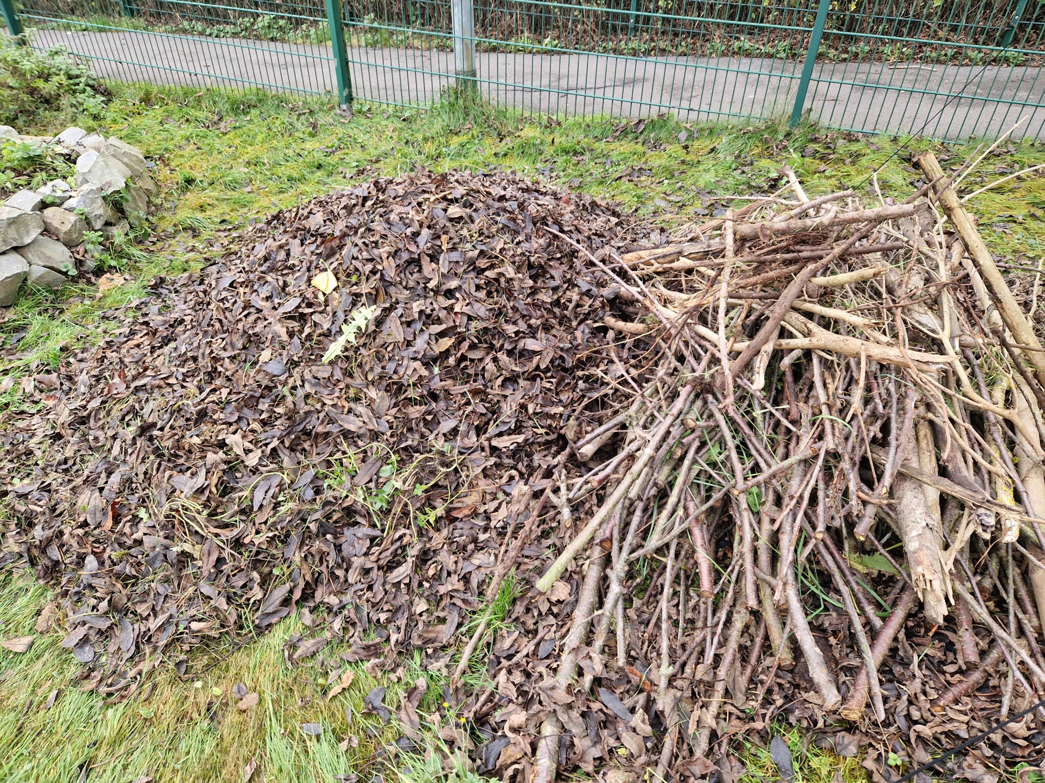 Projekt 2: Wir haben aus Totholz eine 2,50m lange, 80 cm breite und ca. 1,50 hohe Benjeshecke gebaut (O-Ton von einem Viertklässler: Ihr müsst darauf achten das richtige Holz zu nehmen, ich habe recherchiert, dass Nadelholz die Flügel der Bienen verklebt) An die Hecke haben wir ein neues Wildbienenhotel gehängt