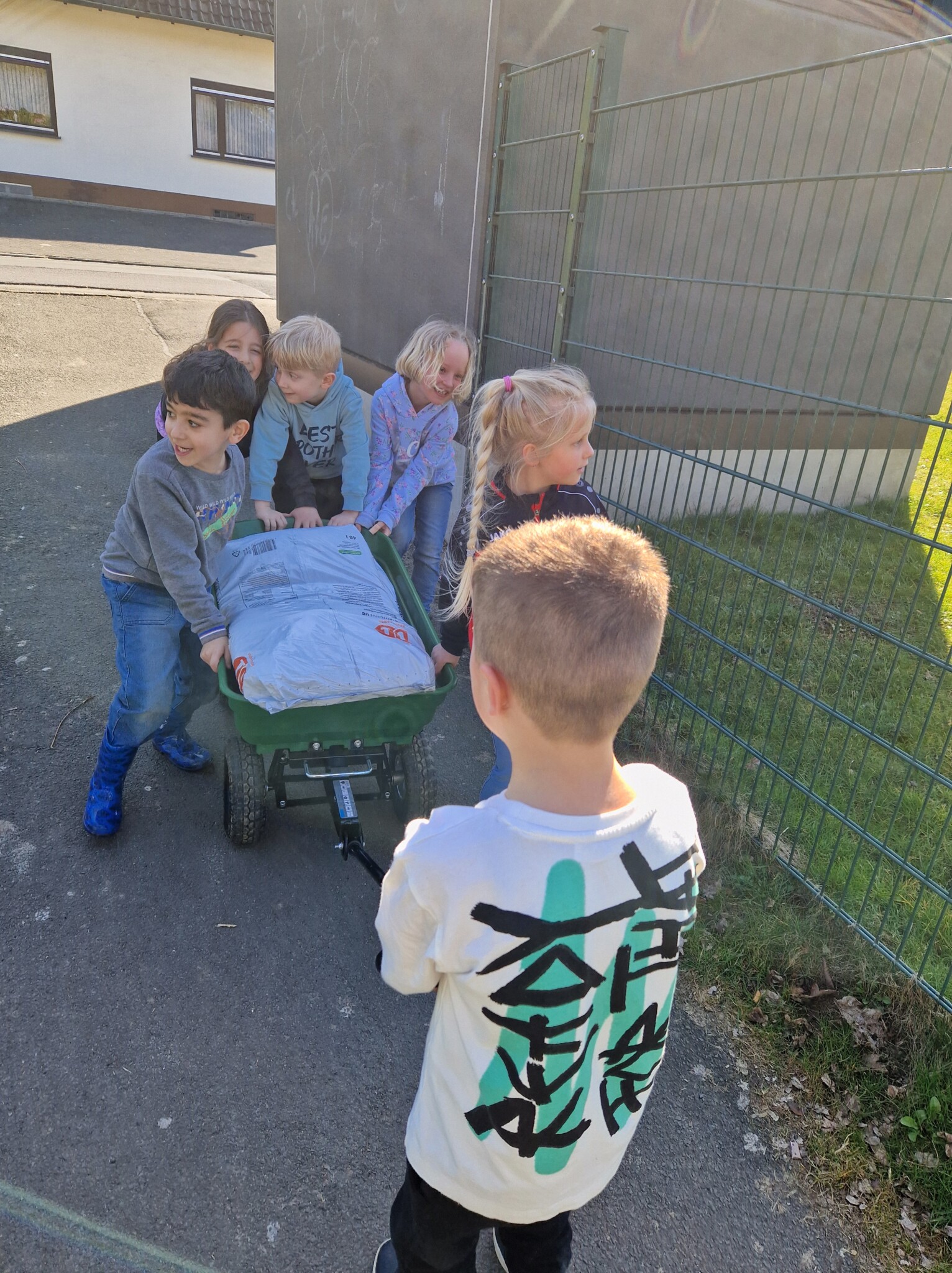In unseren Beeten stehen überall selbstgebastelte Insektentränken und an den Bäumen haben wir selbstgebaute Ohrenkneiferhotels. Unser Garten ist mittlerweile autark, wenn wir kurze Stücke mähen ( nur noch die Wege, kein ganzes Grundstück mehr, damit die Wiese mehr Möglichkeiten hat zu wachsen), dann mit einem Elektrorasenmäher den wir mit Solarenergie von einer gespendeten kleinen Photovoltaikanlage (Dank des vollen Einsatzes eines Vaters) auf unserem Gartenhaus, speisen. Das Gießwasser bekommen wir aus Regentanks, die an die Regenrinnen der Schulen angeschlossen sind. Dies war alles ist nur durch den unermüdlichen Einsatz unserer Nachbarschaft und Eltern möglich, die sich so für dieses Projekt begeistern.
