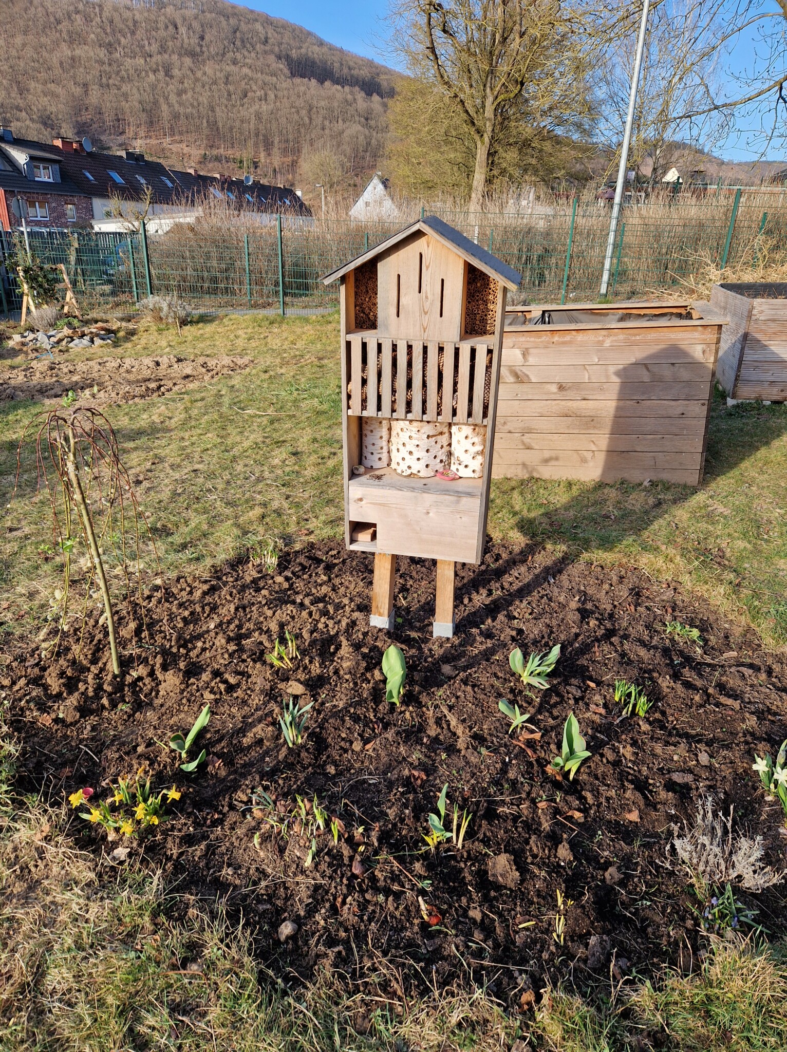 Für das Frühjahr hatten wir letztes Jahr im Oktober jede Menge Frühblüher gepflanzt um frühzeitige ein Nahrungsangebot zu bieten. Dazu kam jetzt im Frühjahr noch eine kleine Sal Weide, ein Holunderbusch und Kirschbäume.
