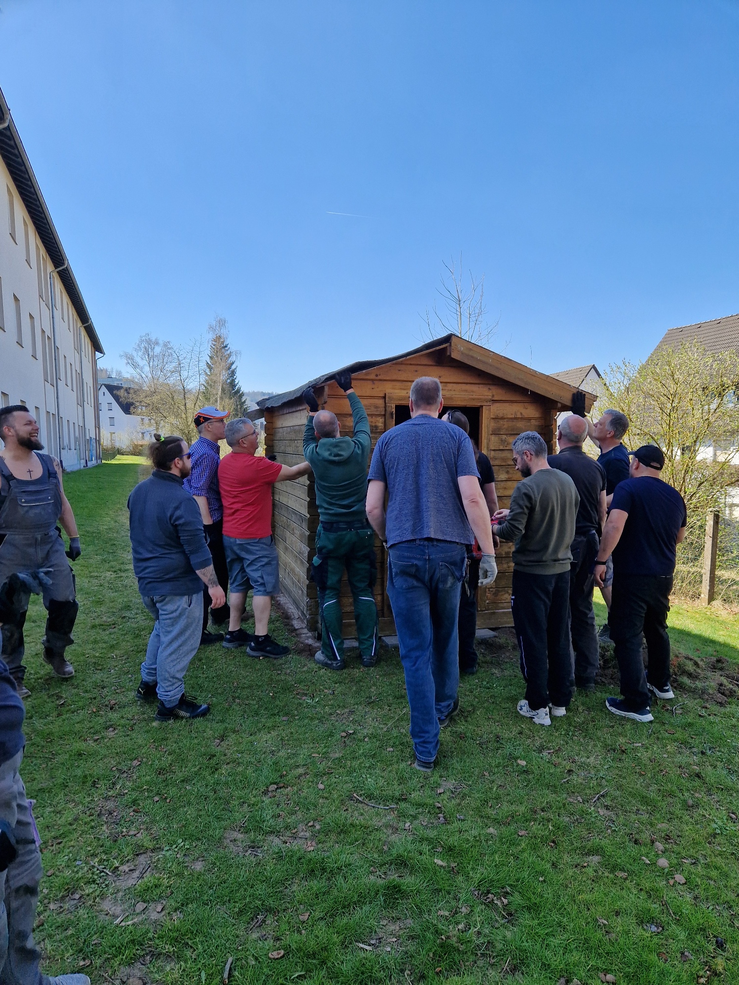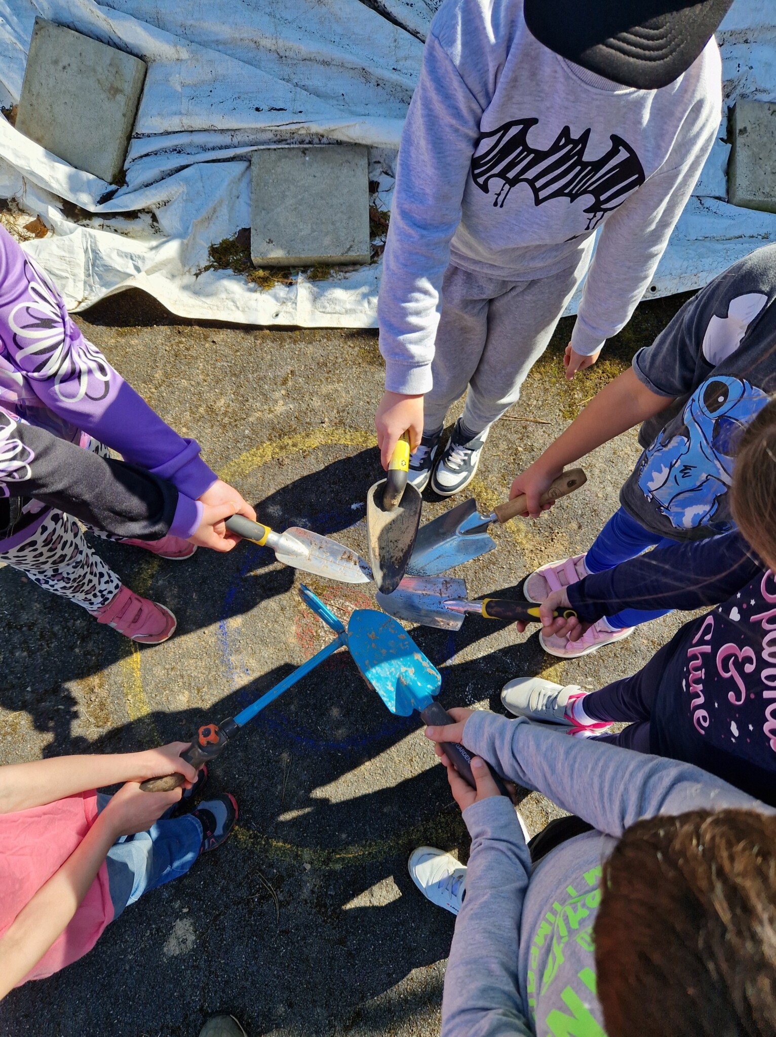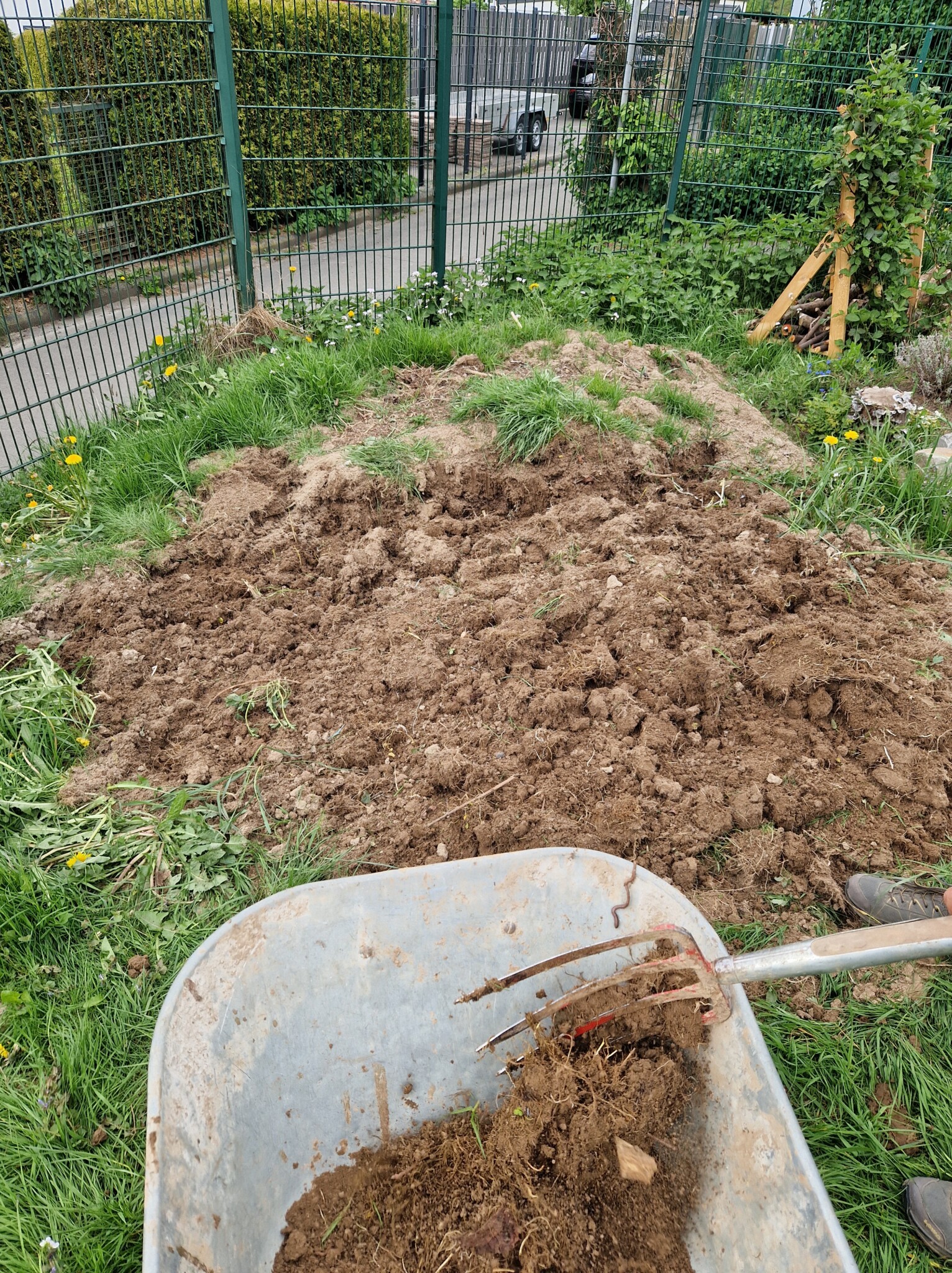 Mit Hilfe von Eltern, Nachbarschaft und Firmen haben wir den Garten nochmals umstrukturiert so dass wir im Februar wieder vor einer großen Baustelle standen. Die Hochbeete wurden umgestellt um mehr Platz zu schaffen, es mussten Rollator und Rollstuhlgerechte Wege her. Der Erdaushub kam dann erstmal in eine Ecke. Das grüne Klassenzimmer musste begradigt werden und auch das waren massive Erdarbeiten. Ich habe zwischendurch echt gedacht, dass war es mit der grünen Bienenoase. Unser Garten sah aus wie ein Schlachtfeld.