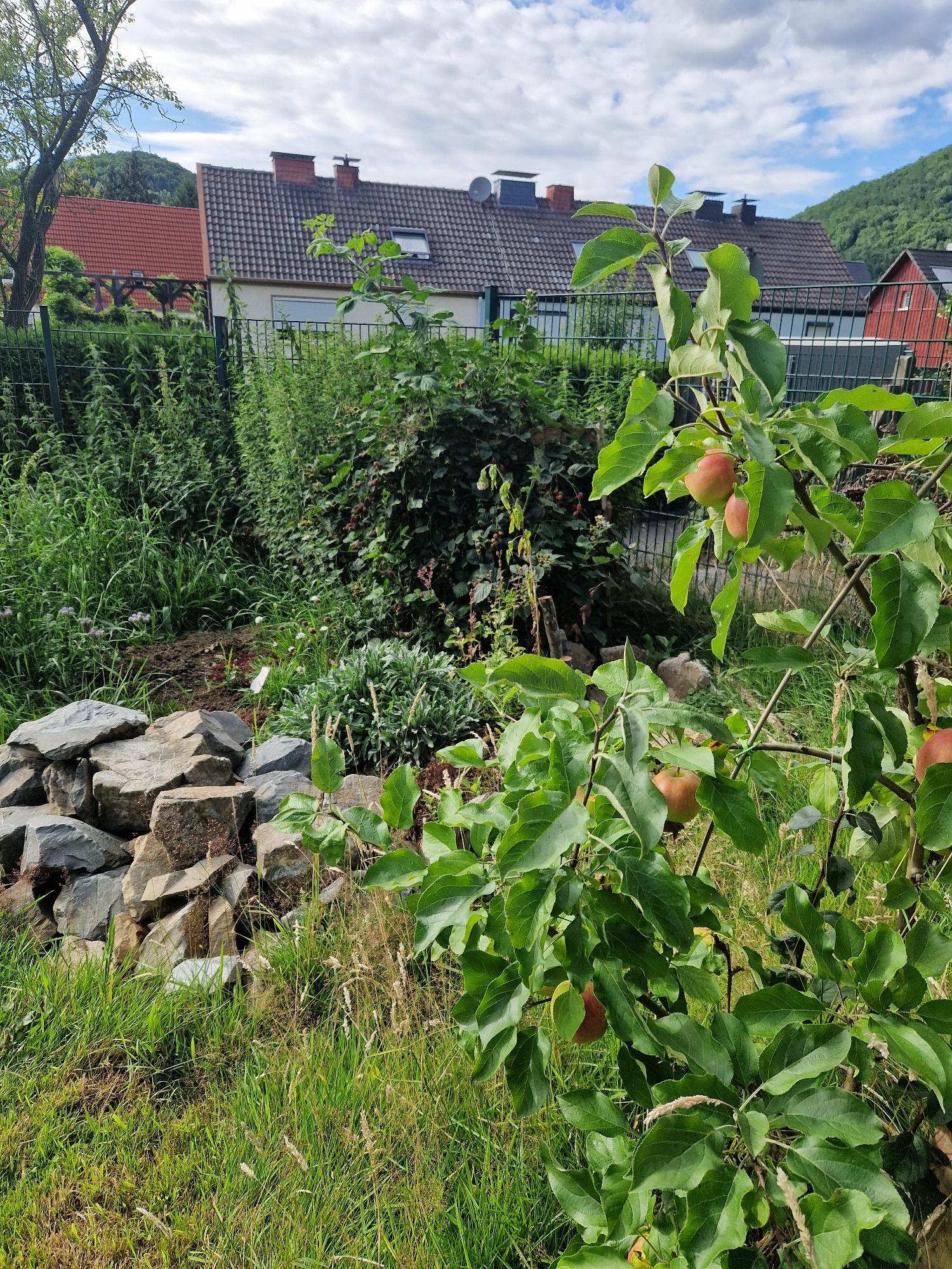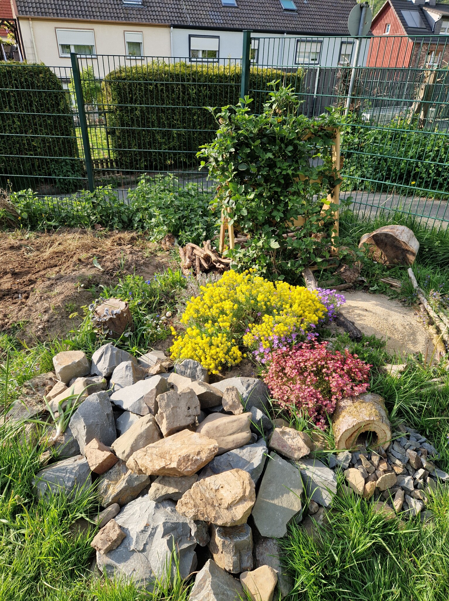 Unser Lesesteinhaufen mit den großen Schneckenhäusern und die Natursteinmauer als Kräuterspirale sind geblieben bzw. erweitert worden