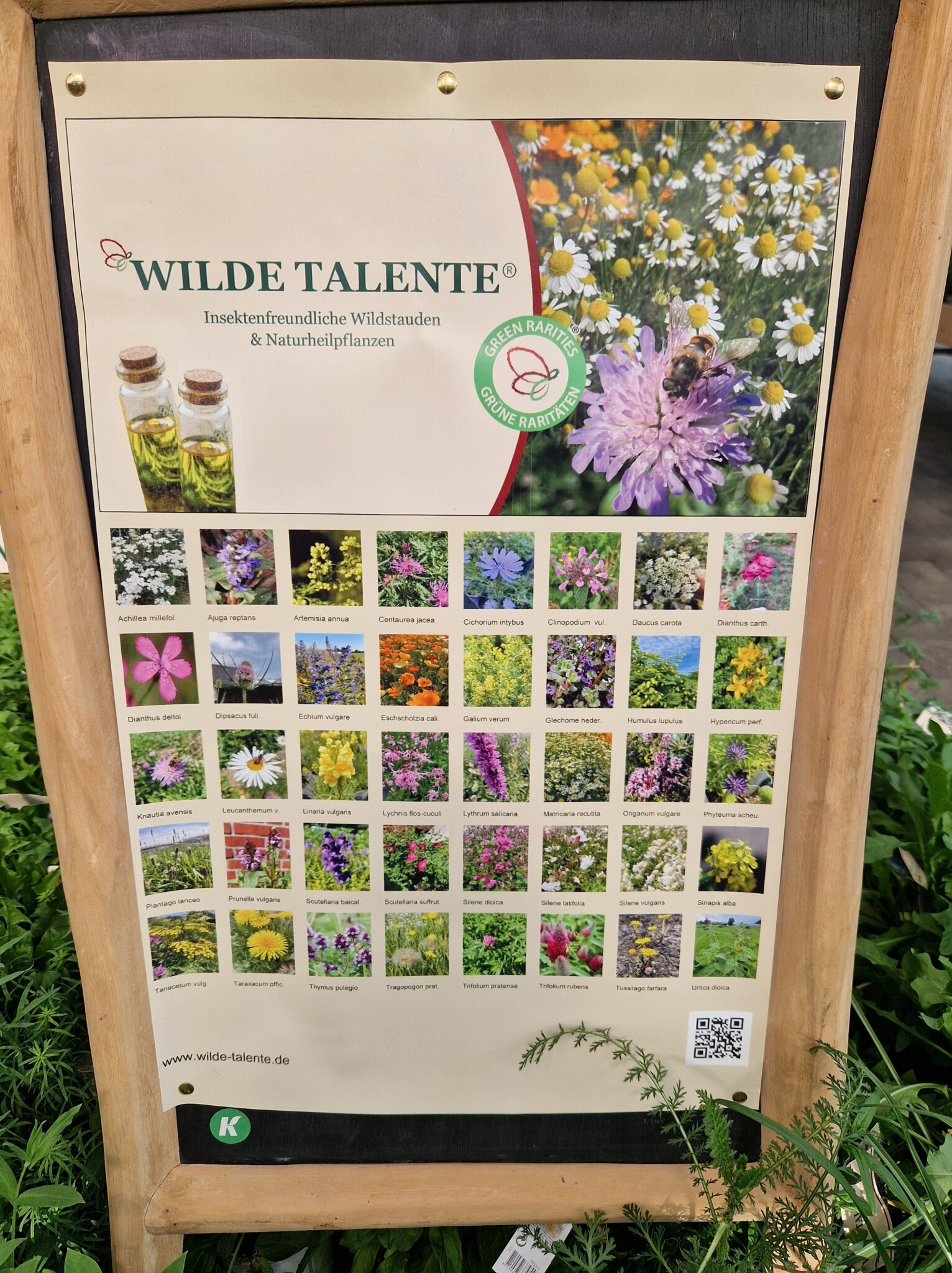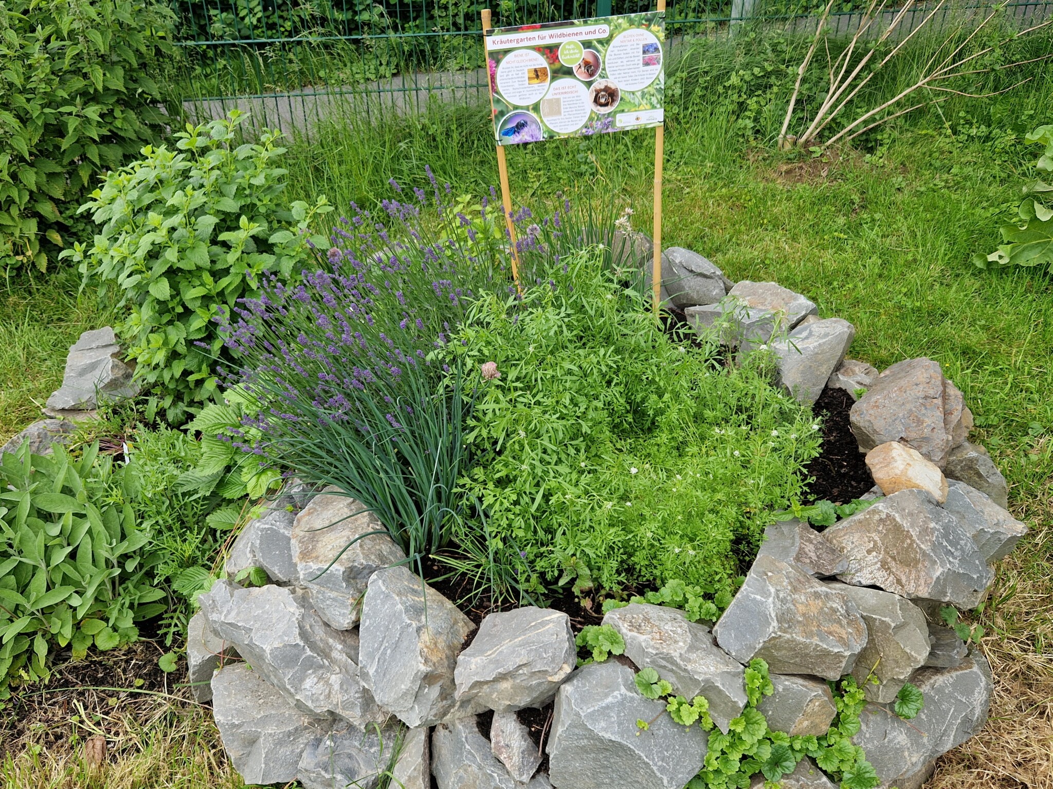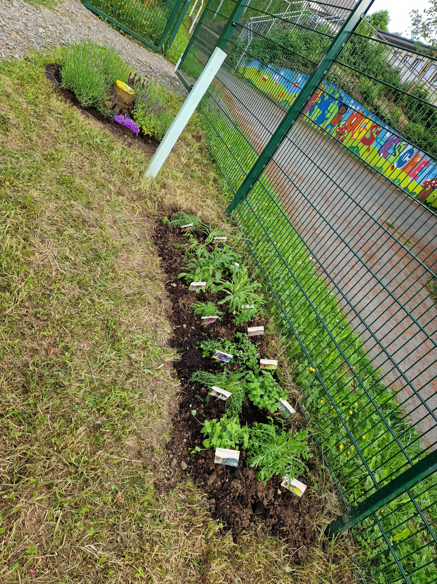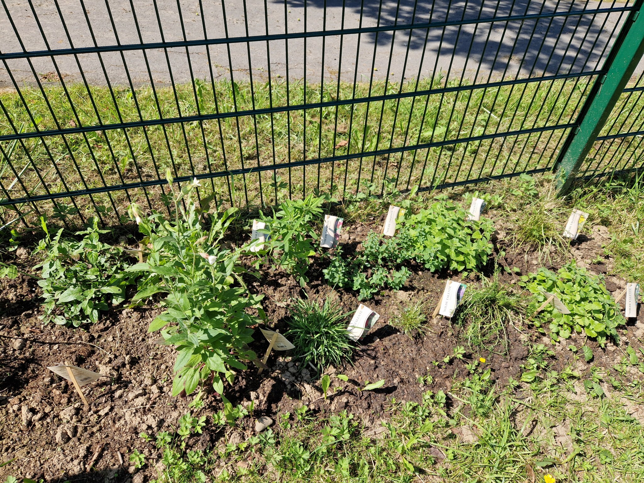 Projekt 6: Heimische Kräuter und insektenfreundliche Pflanzen. Zusätzlich zum Herbaria Kräuterpaket sind auf einer Fläche von ca. drei mal zwei Meter unsere Wilden Talente mit samt Infotafel eingezogen. Wir haben ein Extrabeet für die wilde Möhre, den Rainfarn, Wirbeldost, Gundermann, Wegwarte, Scheuchzer Teufelskralle, Lichtnelke und noch viele Pflanzen mehr von den Wilden Talenten angelegt. Von Gartenbau Born haben wir dafür extra Infotafeln erhalten um die Besucher über die Nützlichkeit dieser Kräuter zu informieren