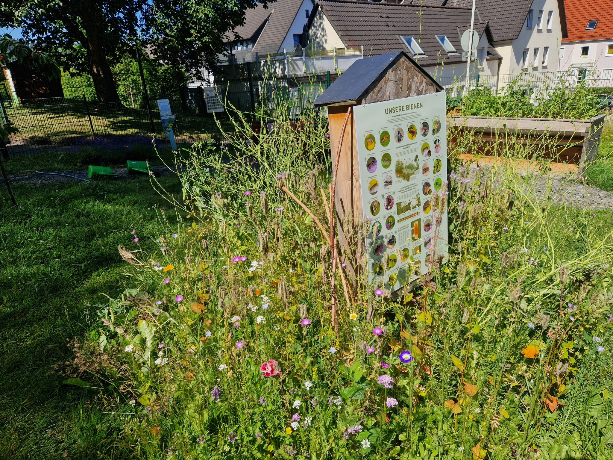 Im Garten befinden sich jetzt 8 Hochbeete mit verschiedenen Gemüsesorten, Erdbeeren, Kürbis, Zucchini etc. 8 Obstbüsche wie Johannisbeeren, Stachelbeeren, Him- und Brombeeren. Ein Kartoffelacker, drei Wildblumenbereiche ca. 80qm groß, eine große Wildwuchsecke, Totholzbereich, Benjeshecke, Naturerdhaufen, Beete mit heimischen Pflanzen und Kräutern, eine Kräuterspirale mit Trockenmauer, 5 Bienentränken , davon eine etwas größere, ein Sandarium, vier Lehmwände, zwei Bienenhotels, zwei Kirschbäume, ein Apfelbaum, ein Pflaumenbaum, eine Weide, ein Holunderbusch (gerettet aus dem Grüncontainer) mehrere Infoschilder über Wildbienen und heimische Pflanzen, ein Wurmkomposter für den natürlichen Dünger.