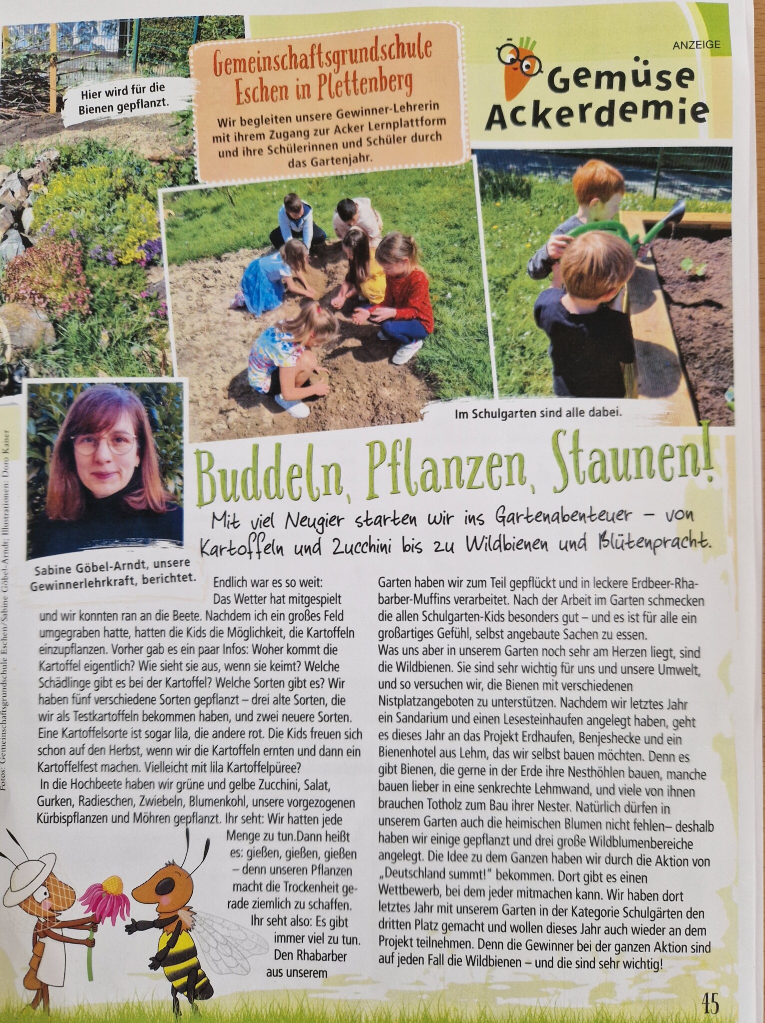 Auch aus diesem Grund machen wir dieses Jahr wieder mit, die Kinder, Schule, Nachbar, Eltern und das Stadtviertel hat ein gemeinsames Ziel: Wir tun was für Bienen. Während sich letztes Jahr ungefähr 25 – 30 Kinder zögerlich für den Schulgarten angemeldet hatten, waren es dieses Jahr von 135 Schulkinder 80 die mitmachen wollten. Sie alle wollten etwas für die Bienen tun und großes bewirken. Das rein aus organisatorischer Sicht für mich alleine als Lehrkraft hinzubekommen war schon eine große Herausforderung, die wir aber gut gemeistert haben. Eine junge Kollegin die im Mai an unserer Schule angefangen hat, ist sofort begeistert mit eingestiegen. Auch mich hat dieses Projekt so inspiriert, dass ich jetzt ein Studium zur Natur und Umweltpädagogin gestartet habe. Außerdem kamen wir so begeisternd rüber, das wir für die Zeitschrift “Mein kleiner schöner Garten“ ein Jahr lang in jeder Ausgabe über unseren Schulgarten und die Wildbienen schreiben dürfen. (in der Juli Ausgabe auch über Deutschland summt) Im Juni kam sogar jemand von unserem lokalen Radio Sender vorbei um in unserem Garten die Euphorie der Kinder einzufangen. Der Bericht über die Arbeit im Garten, den Einsatz für die Wildbienen und unser Einsatz für Deutschland summt, wurde dann im Radio gesendet.
