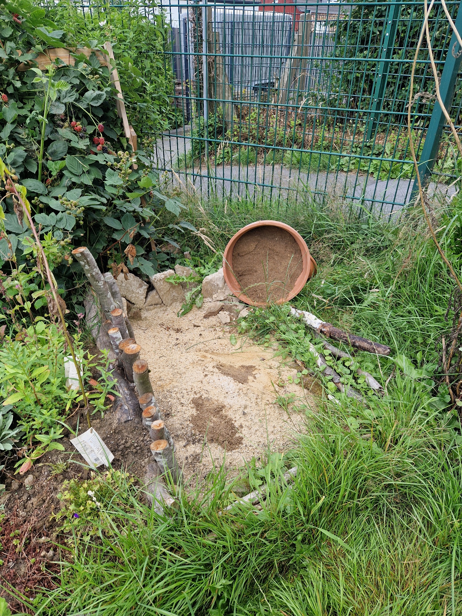 Projekt 8: In unserem Wildwuchs und Totholzbereich mit dem Sandarium gibt es jetzt eine große Brombeerhecke damit die trockenen Stängel nachher als Nisthilfe genutzt werden können